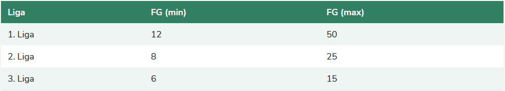 Nach wie vor gibt es keine Bonus-FGs bei Aufstiegen und Meisterschaften. Die FGs werden streng nach Einteilung (siehe z.B. FAQ1) vergeben. Meisterschaften werden somit immer mit mind. +2 FG belohnt. Aber: Nach wie vor gelten auch die Mindest-FG und Maximal-FG, die von Liga zu Liga unterschiedlich sind (siehe nächste Grafik). Somit sind auch mal Sprünge im FG-Wert möglich, wenn ein "zu kleiner" Verein - vom FG-Wert her - in die höhere Liga aufsteigt oder ein "zu großer" Verein absteigt.