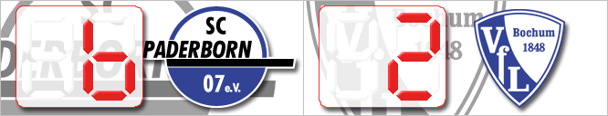 | Nach der unglücklichen Niederlage gegen Lautern, musste man unbedingt gegen Bochum gewinnen, um an die an Dresden abgegebene Tabellenführung nicht abreißen zu lassen. Paderborn schien auch motiviert, nur klappte es nicht so gut mit der Chancenauswertung zu Anfang. Erst in der 23. Minute sollte die Führung fallen, Sohler per Kopf. Paderborn machte weiter Druck, und konnte so per Nachschuss durch Thurk kurz vor der Hz das 2-0 erzielen. Die zweite Hälfte gestaltete sich ähnlich wie die erste, Paderborn mit mehr Druck und mehr Chancen. So konnten Szabics in der 54. und Sohler in der 71. Minute auf 4-0 erhöhen, ehe Madsen in der 73. Minute auf 1-4 verkürzen konnte. Paderborn spielte weiter nach vorn und so konnte Szabics mit zwei Treffern (83. & 88. Minute) auf 6-1 erhöhen. Den Schlusspunkt setzte Adzic in der 90. Minute. Paderborn schien gut von der Niederlage gegen Lautern erholt und kann nun zuversichtlich in die letzten zwei wichtigen Spieltage der Hinrunde blicken. | ||||