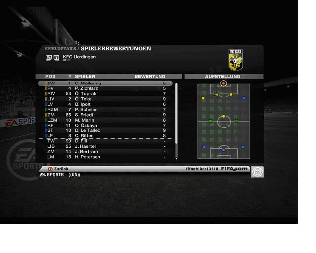 Wessels (6, Wuppertal) - Teke (8, Uerdingen), Beisel (9), Kruse (8), Savelsberg (9, alle Wehen) - Harnik (9, Aachen), Varela (8, Wuppertal), Fuchs (9, Wehen), Baya (9), Marin (9, beide Uerdingen) - Le Tallec (9, Uerdingen)