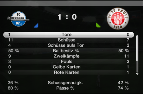 | Mit Paderborn und St. Pauli trafen zwei Mannschaften aufeinander, die auf eine Platzierung im oberen Tabellendrittel schielen können. Notwendig hierfür natürlich drei Punkte... Beide Teams machten allerdings nicht den Anschein, dass sie unbedingt gewinnen wollten. Die erste Halbzeit war nicht wirklich ansehnlich. Es gelangen so gut wie keine vernünftigen Spielzüge, von Chancen gar nicht erst zu sprechen. Entsprechend ging es mit 0-0 in die Kabinen. Die zweite Halbzeit begann dann etwas aufregender. Direkt nach dem Anstoß ein leichtfertiger Ballverlust der Paulianer im Mittelfeld. Paderborn schaltete schnell um und schickte Szabics, der freie Bahn aufs Tor hatte. Tsoumou-Madza weiß sich nur mit einer Notbremse - dummerweise im 16er - zu helfen. Die Konsequenz : Elfmeter und Rote Karte. Szabics trat selber an und versenkte eiskalt; 1-0 nach 48 Minuten mit dem ersten Torschuss der Ostwestfalen. Je länger das Spiel fortschritt, desto mehr Platz hatten die Gastgeber zum kontern, doch nutzen sie dies nicht. Mitte der zweiten Halbzeit entstanden zwei Chancen nach einer Ecke, allerdings scheiterte man an Piquett bzw. dem Pfosten. Pauli drängte auf den Ausgleich, doch Paderborn stand hinten halbwegs sicher. In der 90. Minute dann die Chance zur Entscheidung. Szabics erneut mit freier Bahn, spielt Piquett aus und das Tor ist leer! Allerdings schaffte Szabics den Kunstschuss aus 16m Entfernung 10m neben das leere Tor zu schießen. Zu seinem Glück rächte sich dies nicht und er wurde dennoch Matchwinner. Schwer zu sagen, ob der Sieg verdient war. Bis zum Elfmeter war von beiden Teams nichts zu sehen. Wahrscheinlich wäre es am Ende ein 0-0 geworden. In Paderborn nimmt man aber auch solche Siege gerne, wie schon zuvor im Heimspiel gegen Mainz. | ||||