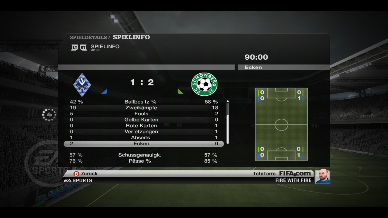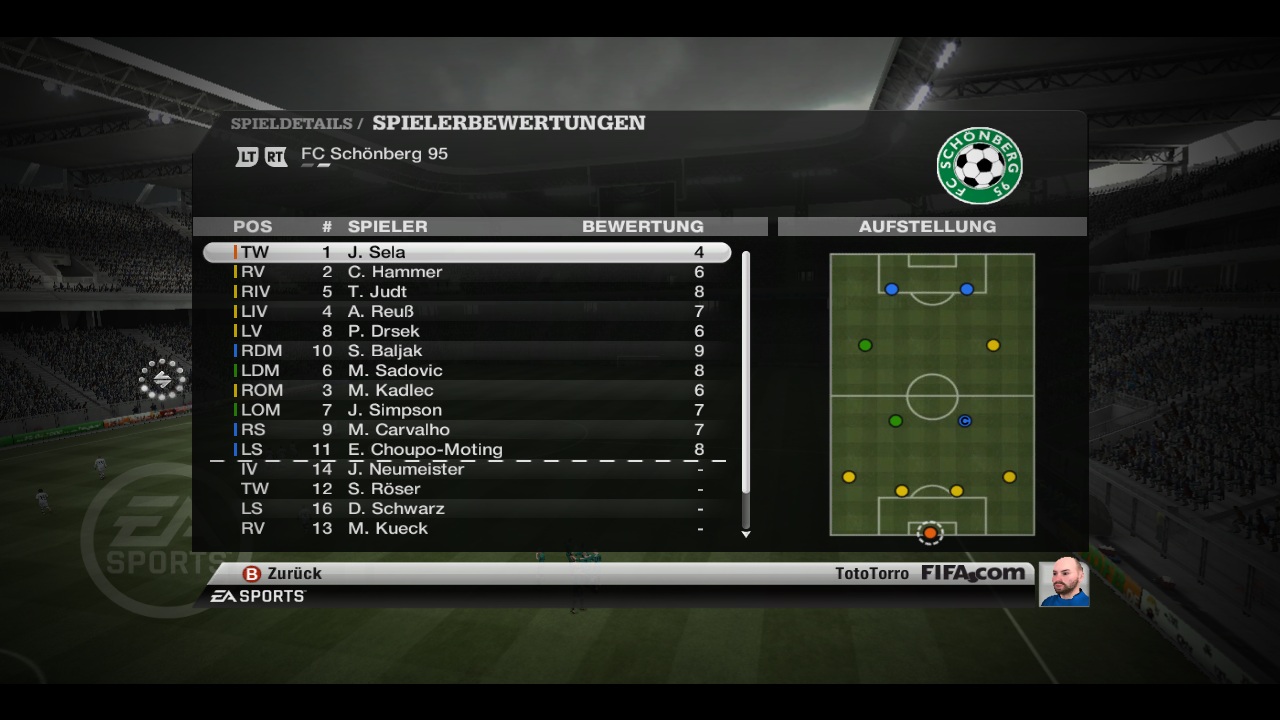 Schönberg erduselt sich Sieg gegen Waldhof In einem Nachholspiel vom 29. Spieltag trat der FC Schönberg 95 bei Waldhof Mannheim an. Das Hinspiel hatte Schönberg nur knapp mit 1-0 für sich entscheiden können und Waldhof hatte in der Rückrunde bisher ganz ausgezeichnete Ergebnisse vorzuweisen, unter anderem den bisher einzigen Sieg eines Drittligisten gegen den Meister der 3. Liga Chemnitz. Schon die Anfangsminuten zeigten die unterschiedliche Spielanlage der beiden Teams - die Waldhofbuben kampfstark, mit guter Abwehrarbeit und mit schnell vorgetragenen Angriffen über das starke Sturmtrio França, Davids und N'Diaye. Schönberg versuchte mit Kurzpassspiel im Mittelfeld zum Erfolg zu kommen und Lücken in der Mannheimer Abwehr zu finden. Zu Beginn des Spiels war jedoch Waldhof erfolgreicher. In der 9. Minute führte eine schnelle Ballstafette durch das Mitelfeld über Pienaar, Davids und N'Diaye zum Führungstreffer durch França. Die Schönberger Abwehr war zu diesem Zeitpunkt völlig ungeordnet, weil sich der rechte Aussenverteidiger Hammer kurz zuvor in den Angriff eingeschaltet hatte, sich aber bei einem Schussversuch im Mannheimer Strafraum verletzt hatte und daher hinten fehlte. Schönberg versuchte ruhig und konstruktiv weiterzuspielen, wurde aber in der 12. Minute wieder kalt erwischt. França spielte aus dem Mittelkreis steil auf Davids, der am linken Flügel dem immer noch leicht hinkenden Hammer entwischte und allein aufs Tor zulief. Davids versuchte den herauseilenden Schönberger Torwart Sela mit einem Flachschuss zu überwinden, traf aber nur Selas Beine und dieser konnte den Ball klären. In den folgenden Minuten entwickelte Schönberg zum ersten Mal so etwas wie Druck auf die Mannheimer Abwehr, aber im entscheidenden Moment war immer ein Abwehrbein im Weg. In der 17. Minute konnte Baljak im Mittelfeld einen verunglückten Pass aus dem Mannheimer Strafraum heraus abfangen, den er sofort auf Carvalho weiterleitete. Carvalho spielte den Ball per Hacke parallel zur Strafraumgrenze zu Choupo-Moting, der zwischen zwei Verteidigern hindurch in den Strafraum startete und den Ball aus etwa neun Metern zum 1-1 Ausgleich im kurzen Eck versenkte. In den folgenden 15 Minuten spielte sich das Geschehen hauptsächlich im Mittelfeld ab. Schönberg unterband jetzt die Mannheimer Angriffe meist schon früh, konnte sich selbst aber nicht gegen die Waldhofabwehr durchsetzen. Erst in der 32. Minute gab es wieder eine nennenswerte Aktion, als Simpson von Choupo-Moting in halblinker Position freigespielt wurde, mit seinem Schuss aus 7 Metern aber an Schäfer scheiterte. Im direkten Gegenzug hatte Waldhof eine grosse Möglichkeit erneut in Führung zu gehen. Davids war wieder frei durch, schoss aber, von Judt unter Druck gesetzt, genau auf Sela. Den folgenden Eckball köpfte Pienaar zwar Richtung Tor, aber Judt konnte den Ball abfangen und klären (35. Minute). Kurz vor der Halbzeitpause hatte França eine weitere Möglichkeit, verfehlte aber aus etwa 17 Metern das lange Eck mit seinem Schuss (43. Minute). Im Gegenzug dann die spielentscheidende Szene. Simpson versuchte einen Flankenlauf auf dem linken Flügel, wurde aber vom Mannheimer Sturm verfolgt und schliesslich in der Nähe der Eckfahne vom Ball getrennt. Sturm passte den Ball zu seinem Torwart Schäfer, dem das Leder durch die Beine rollte und von seiner Hacke sprang der Ball ins Tor zum 1-2 (45. Minute). Totenstille im Stadion, selbst die Schönberger Fans waren völlig baff, ob dieser unerwarteten Führung. Kurz darauf ertönte der Pausenpfiff. Die ersten 25 Minuten der zweiten Halbzeit sahen zwar ein im Mittelfeld sehr intensiv geführtes Spiel, aber ohne echte Torchancen. Erst in der 70. Minute hatte Baljak eine Schusschance von knapp ausserhalb des Mannheimer Strafraums, zielte aber am langen Pfosten vorbei. Waldhof wechselte dann den Ex-Schönberger Orahovac für N'Diaye ein. Waldhof hatte dann in der 80. Minute eine Riesenchance zum Ausgleich. França lief verfolgt von zwei Schönberger Verteidigern aufs Tor zu, entschied sich aber nicht selbst zu schiessen sondern quer auf den mitgelaufenen Orahovac zu legen. Der Pass war aber zu ungenau und wurde von Sadovic abgefangen. In der 88. Minute dann der nächste Aufreger. Wieder war França durch und lief aufs Schönberger Tor zu, allerdings mit Kadlec im Schlepptau. Kadlec versuchte ein Tackling und traf den Ball, aber auch ganz viel França und der Schiedsrichter enschied auf Notbremse - rote Karte! Den Freistoss legte Orahovac ab auf França, dessen Schuss aus 16 Metern Sela aber zur Ecke lenken konnte. Den folgenden Eckball köpfte wieder França über das Tor. Schönbergs Trainer beordert Drsek für die letzten Spielminuten auf die linke Verteidigerposition, aber die Schönberger Abwehr geriet nicht mehr unter Druck. Auf der Gegenseite hielt Schäfer einen Freistoss von Simpson in der Nachspielzeit sicher, dann pfiff der Unparteiische ab. Trainerstimmen: Toto Torro (FC 95): "Natürlich bin ich froh, dass wir gewonnen haben und einen weiteren Schritt Richtung Platz 2 und direktem Aufstieg gemacht haben. Aber wir haben hier nur mit viel Glück gewonnen, unter gütiger Mithilfe von FIFA11 - da kann man nur mit dem gegnerischen Trainer fühlen, denn so etwas wünscht man niemandem. Ich hoffe, dass TWeggi in seinen letzten Saisonspielen mehr Fortune hat als heute." TWeggi (Waldhof) wollte sich aus verständlichen Gründen nicht äussern. |