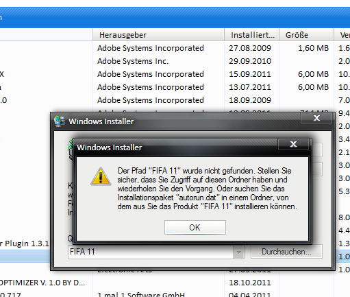 Wenn ich über Systemsteuerung usw. gehe, haut es nicht hin. Über Origin kann ich FiFa11 auch nicht löschen, da leitet er mich zu Software und Programme.