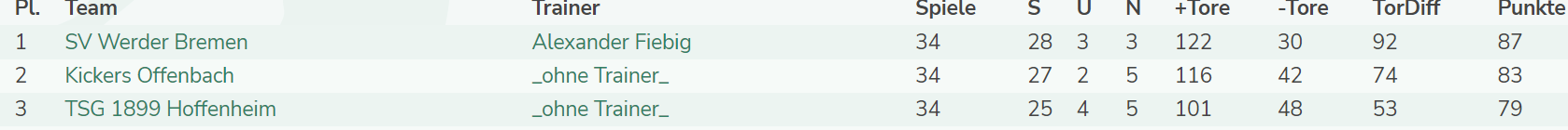 Unter 26.Saison Transfermarkt findest du die beiden Trainertabellen für die 1. und 2.Liga. Zudem sind die Tabellen in den jeweiligen LiveTicker-Threads im ersten Post eingepflegt.