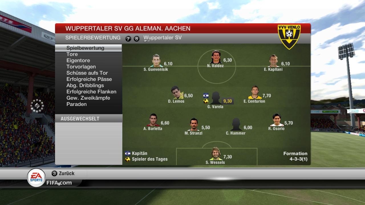 Die Alemannia zu Gast in Wuppertal ! Heute gastierte die Alemannia aus Aachen im Wupertaler Stadion am Zoo! Das heißt auch der Tabellen 17. gg den Tabellen 5. der Dritten Liga. Von der Tabelle her eine klare Sache.Die Wuppertaler haben sich nicht viel ausgemacht gg die Starken Aachener. Wuppertal heute mal mit einer offensiven 4-3-3 Aufstellung gg ein 4-2-2-2 der Aachener. Alle Fans im Stadion sollten auf ihre Kosten kommen. Das Spiel begann wie immer für Wuppertal, das 0:1 lies nicht lange auf sich warten. In der 11. Spielminute vertändelt ein WSV Spieler den Ball im Lauf Duell. Der Aachener Spieler läuft über aussen und passt den Ball flach in den Strafraum, und da steht Banser völlig frei und brauch nur noch den Fuss hinhalten. 0:1.....Das grauen geht weiten in Wuppertal. Aber die Wuppertaler gaben heute nicht klein bei. Sie spielten weiter frech nach vorne, mustsen dabei aber aufpassen das sie nicht in ein Konter laufen.In HZ eins erspielten sich beide Mannschaften noch ein paar Chancen aber das war es auch.PAUSENPFIFF......... Recht ausgeglichen die Statistik. Von der Statistik her eine glückliche Führung für die Aachener. In Halbzeit 2 wollte Wuppertal den Ausgleich erkämpfen.Eine heftige Ansprache von Trainer Spreeborusse in der Kabine hat die Spieler wach gerüttelt. Die Fans peitschen den WSV nach vorne: Die Fans skandieren "Auf gehts Wuppertaler Jungs, schiesst ein Tor für uns"! In der 55. Minute die Erlösung im Stadion am Zoo! Flanke von aussen auf......auf wenn denn eigentlich.....egal..... Fallrückzieher und der TW der Aachener kann den Ball klären. Die Achener bekommen den Ball nicht raus, so das er bei einem WSV Spieler landet, der sieht das Varela kommt, Pass auf Varela und der kommt frei zum Schuss aus gut 18 Meter geht der Ball ins untere linke Eck...... 1:1......Das Stadion tobt, der Trainer flippt aus, er tritt eine Werbebande vor Freude kaputt, das machte er die letzten Spiele eigentlich nur aus Frust! In weiteren Spielverlauf hatten beide noch ihre Chancen.Es war ein sehr ansehnliches Spiel für die Zuschauer.Doch es sollte kein Tor mehr fallen. Damit trennten sich beide Teams 1:1.Was den Wuppertalen in ihrer Situation nicht weiter hilft.Ein Sieg war heute drin, aber es sollte nicht sein. Trainer Stimmen: Spree: Ich kann meiner Mannschaft heute nur den Vorwurf machen, das sie ihre Chancen nicht konsequent genutzt haben.Mit dem Spielerischen bin ich sehr zufrieden.Der Ball lief heute endlich mal schön sauber in den eigenen Reihen.Mit Aachen hatten wir einen starken Gegner der auch einen guten Ball spielt. Das Spiel heute war seit langer langer langer Zeit mal wieder eins, was mir persönlich Spaß gemacht hat.Ich wünsche Aachen und seinem Coach Evil alles gute für die Saison und denke sie werden so nichts mit der Abstiegszone zu tun bekommen. Evil: "Ich bin heute mit dem Auftreten meiner Jungs nicht wirklich zufrieden. Nach einer Führung darf man einfach nicht so fahrlässig mit seinen Großchancen umgehen. So hat man den Gegner wieder ins Spiel zurückfinden lassen und muss am Ende zufrieden sein dass es ein Remis wurde. Wuppertal spielte tollen Fussball, anders als man es vom Tabellenplatz erwarten würde. Generell war es ein offener Schlagabtausch. Doch leider schwimmen mir so langsam die Felle weg, denn nun warten Topteams in Serie. Wenn da die Nervösität nicht in den Griff bekommen wird. Prost Mahlzeit... Viel Erfolg noch an meinen Trainerkollegen Rodrigo." Screens zum Spiel folgen in kürze...... |