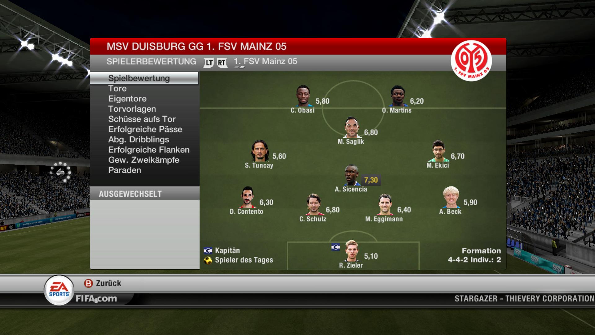 | Glücklicher Sieg für den MSV. Mainz spielte überraschend stark und erspielte sich auch einige Torchancen, spätestens am heute überragenden Hesse (Note 10,0) war aber Schluss. Am Ende hatte Mainz zwar mehr Torschüsse, doch die besseren Torchancen sprachen für den MSV und so geht der Sieg meines Erachtens - natürlich nicht in dieser Höhe - durchaus noch in Ordnung, auch wenn die Mainzer natürlich anderer Meinung sein werden. | ||||