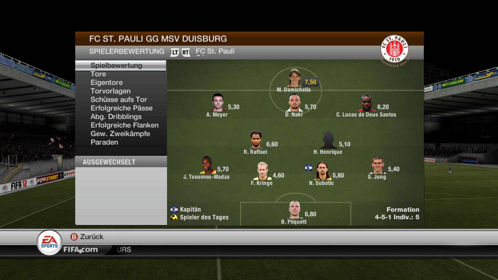 | Der Tabellenführer gegen den Tabellenletzten - eigentlich eine klare Angelegenheit - doch bereits im Hinspiel ärgerte St. Pauli den amtierenden Double Sieger aus Duisburg und trotze dem MSV ein Unentschieden ab. Damals setzte man erfolgreich eine Fußballverweigerungstaktik ein, man ahnte also das schlimmste bei den Gästen. Doch stattdessen traten die Paulianer im 4-5-1 System deutlich offensiver auf und überraschten damit wohl auch die Duisburger Hintermannschaft. Wenige Augenblicke waren gespielt, da war Demichelis durchgebrochen und konnte sich vollkommen alleine vor Torhüter Hesse die Seite aussuchen und zum 1:0 für die Gastgeber einnetzen. Duisburg sichtlich geschockt und mit Problemen ins Spiel zu kommen, sogar das 2:0 hätte bereits fallen können. Nach 22 Minuten dann Aufatmen bei den mitgereisten Duisburger Fans: Peter Lövenkrands trifft nach Vorlage von Grafite zum 1:1 Ausgleich. Die zweite große Chance nutzte der Däne anschließend zum 2:1. Die Vorentscheidung brachte dann kein Tor, sondern eine Notbremse von Henrique in der 42. Spielminute. Es wäre wohl eine gute Möglichkeit zum 3:1 gewesen, aber ein sicherer Treffer war es nicht, folglich kann man diesen Platzverweis wohl als unnötig bewerten. In Überzahl konnte der MSV nun das Spiel in die Hand nehmen. Zwei Toren von Grafite (54. und 56.) folgte zwar noch durch den zweiten Treffer von Demichelis (58.) die Antwort von St. Pauli doch in den letzten Minuten brachen alle Dämme, so dass El Kasmi (78.), Lovenkrands (82.) und Kroos (88., Elfm.) den am Ende viel zu hoch ausgefallenen 7:2 Sieg herausschießen konnten. Kommentar zum Spiel: Rimbach (MSV Duisburg): Auch wenn das Ergebnis und die Spielstatistiken einseitig aussehen, so war das Spiel doch eine ganze Weile auf der Kippe. Erst der Platzverweis hat uns wirklich auf die Siegesstraße gebracht. Ansonsten hätte das Spiel durchaus nochmal kippen können. | ||||