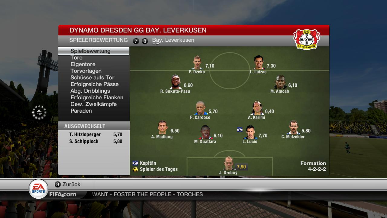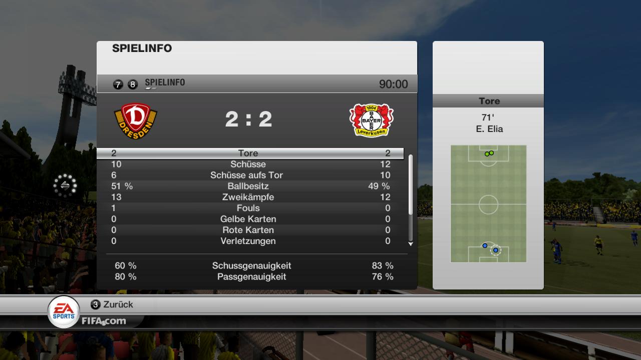 | In einem unterhaltsamen Spiel muss sich Dynamo wieder mit einem Punkt begnügen. Die Sachsen begannen stark und gingen durch Abessadki in Führung, doch bis zur Pause drückte die Pillenelf aufs Tempo und nur dank Leno und Rainer Zufall blieb es beim 1:0. In der zweiten Hälfte übernahm Dresden wieder das Kommando und Elia erlöste Schwarz-Gelben mit der 2:0-Führung. Im Anschluss hatte die Heimelf noch die Möglichkeit den Sack endgültig zuzumachen, doch Bayer lieferte einen heißen Endspurt und kam doch noch zum Unentschieden. Die letzte Chance hatte dann Dynamo, aber die Spieler waren zu platt um die Kugel im Kasten zu versenken. | ||||
