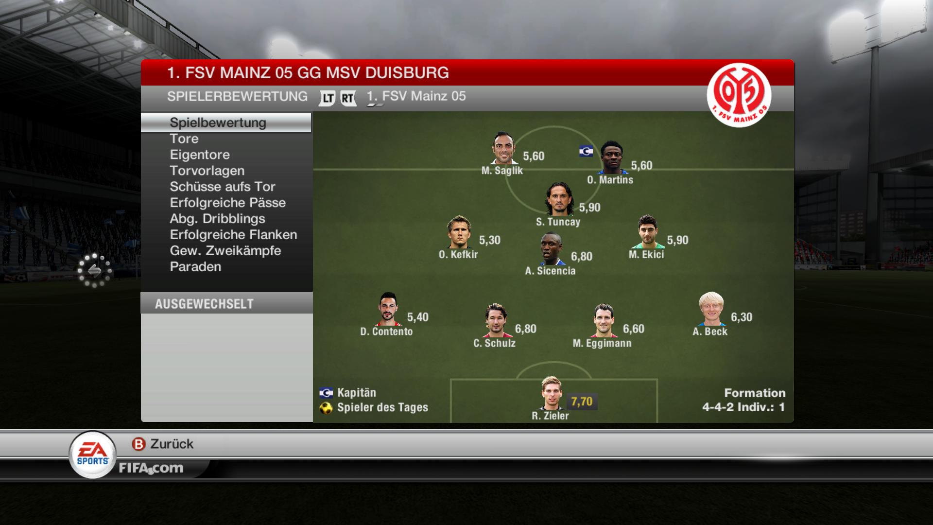 | Zentimeter entscheiden eine ausgeglichene Partie Trotz des am Ende klaren 4:0 Erfolges im Hinspiel, hatte man beim MSV nicht vergessen, was für ein hartes Stück Arbeit die Partie gegen die abstiegsbedrohten Mainzer gewesen war und so ging man vorgewarnt in das Rückspiel, standen die Mainzer doch bereits vor der Partie mit dem Rücken zur Wand und hätten jeden Punkt dringend im Kampf gegen den Abstieg gebrauchen können. Von Anfang an entwickelte sich ein ausgeglichenes Spiel, das Potenzial zum Torfestival hatte, doch davon war es am Ende weit entfernt. Die erste Offensivaktion setzten die Mainzer. Koch kann Saglik den Ball noch vom Fuß spitzeln, doch dieser landet bei Martins der aus fünf Metern an Torhüter Hesse scheiterte. Ähnlich knapp die erste Aktion der Zebras: Nach einer Flanke von Lövenkrands köpft Müller nur wenige Zentimeter am langen Pfosten vorbei. Auch im weiteren Verlauf erlebten die Zuschauer eine offene Partie, bei der jedoch entweder der Torhüter, der Pfosten oder ein Abwehrspieler im letzten Moment den Führungstreffer für eins der beiden Teams verhinderten. Doch in der 56. Spielminute war es dann doch soweit: Ein Konter der Duisburger wird von Lövenkrands per Lupfer über den herauseilenden Keeper Richtung Tor befördert, Zieler reagiert schnell doch nicht schnell genug, der Ball überquert die Torlinie um wenige Zentimeter, ein regelkonformes aber nicht gerechtes 1:0 für den MSV. Mainz in der Folge bemüht das Spiel in die Hand zu nehmen, doch wie schon zuvor gelang es einfach nicht den Ball ins Tor zu bringen und so standen die Mainzer am Ende trotz großem Kampf mit leeren Händen da. | ||||