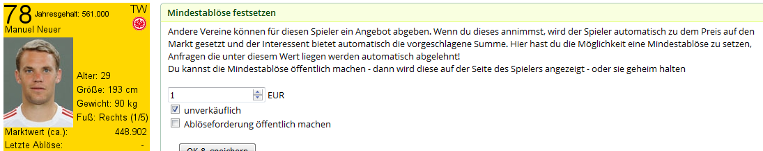 • "Ablöseforderung öffentlich machen" ist halt nicht angehakt. Dadurch bleibt es halt "geheim" ob du einen Wert gesetzt hast oder er unverkäuflich ist.