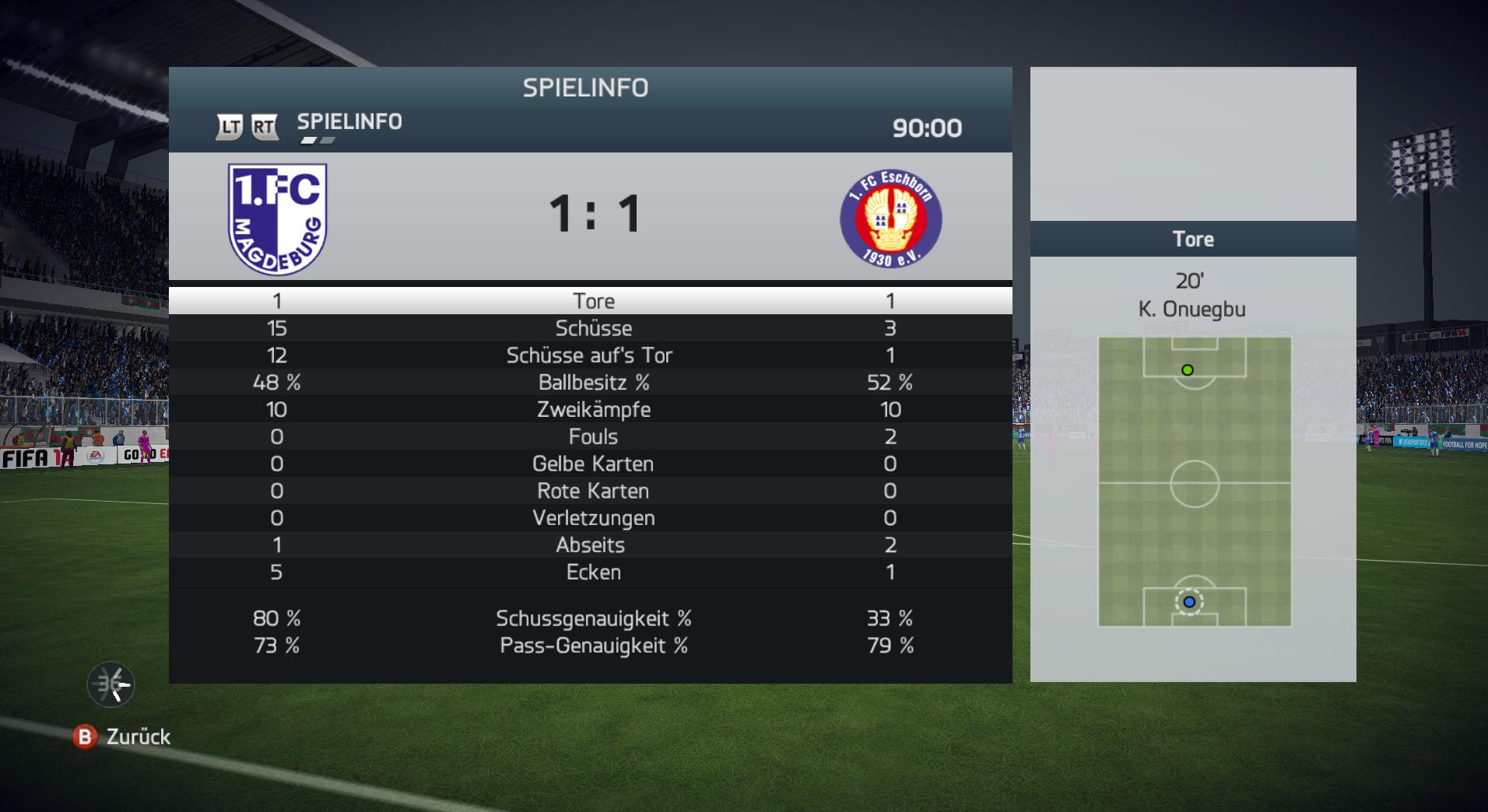 Mit Kampf zum Punktgewinn in Magdeburg Viel gibt es nicht zu berichten. Torchancen ergaben sich in der Regel nur nach Ecken. So auch das 1:0 durch Magdeburg durch Onuegbu in der 20. Minute. Der Ausgleich fast im direkten Gegenzug durch Eckhardt, der mindestens genauso hässlich durch einen hohen Ball in den Sturm angespielt wurde, um dann allein vorm Tor einzuschieben. Magdeburg mit einer überraschend hohen Anzahl an Torschüssen, welche sich aber zumeist nach Eckbällen und anschließenden Abprallern ergaben. Beide Teams mit dem Versuch das Spiel zu kontrollieren, so spielte sich viel im Mittelfeld ab. Am Ende steht hier ein Remis, trotz leichtem Übergewichts seitens Magdeburg. Ein Punkt mit dem wir leben können. | ||||