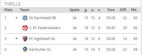 Um den 2.Platz für den direkten Aufstieg sowie den Relegationsplatz 3 kämpfen nun am letzten Spieltag Darmstadt 98 ( 56 ), KSC ( 55 ), K´lautern ( 55 ). Ich hoffe hier und wünsche mir das es Darmstadt und der KSC machen. -