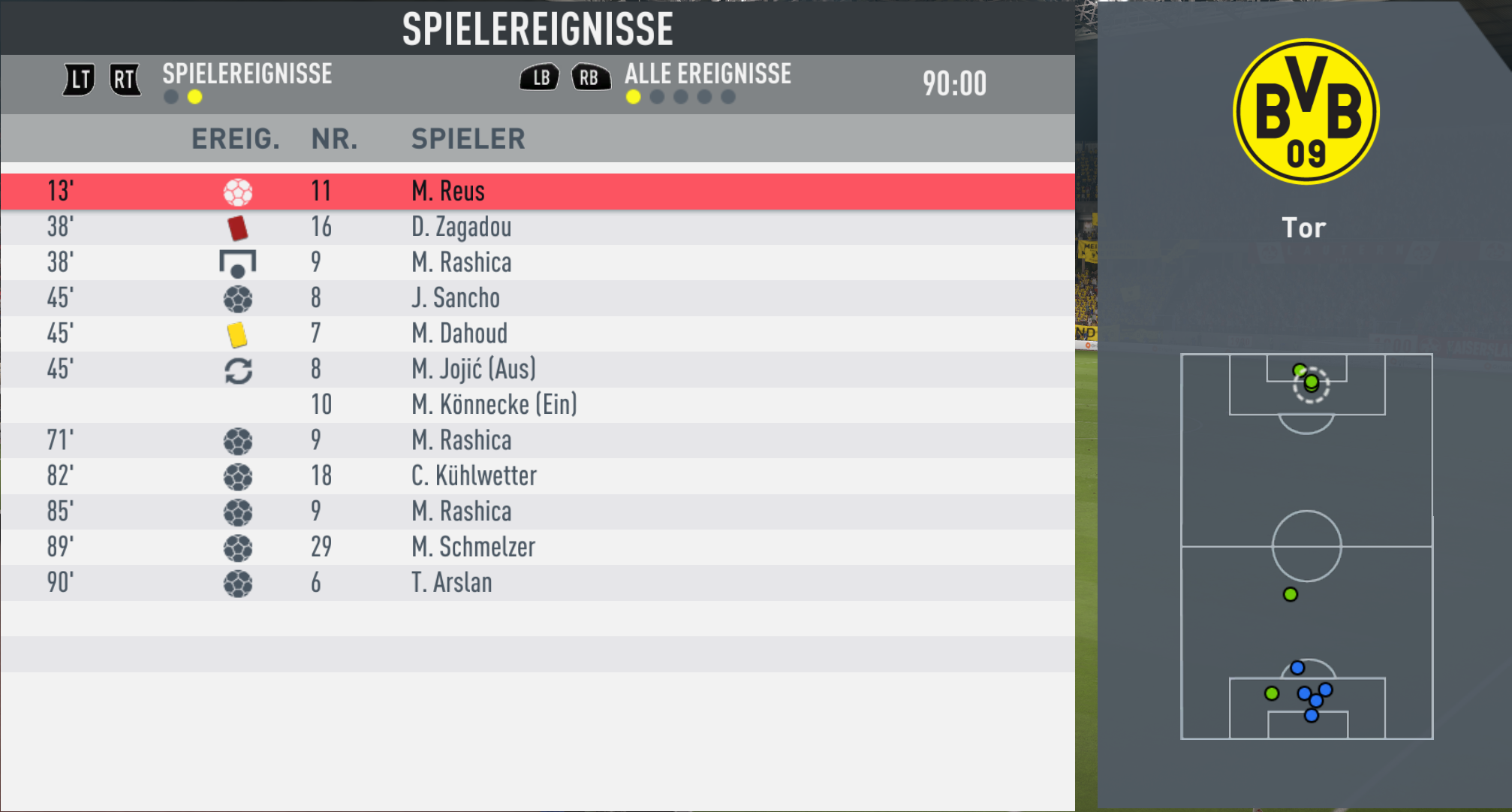 | Arslan (1) Kühlwetter (1) Rashica (3) | (1) Schmelzer (1) Sancho (1) Reus | |||