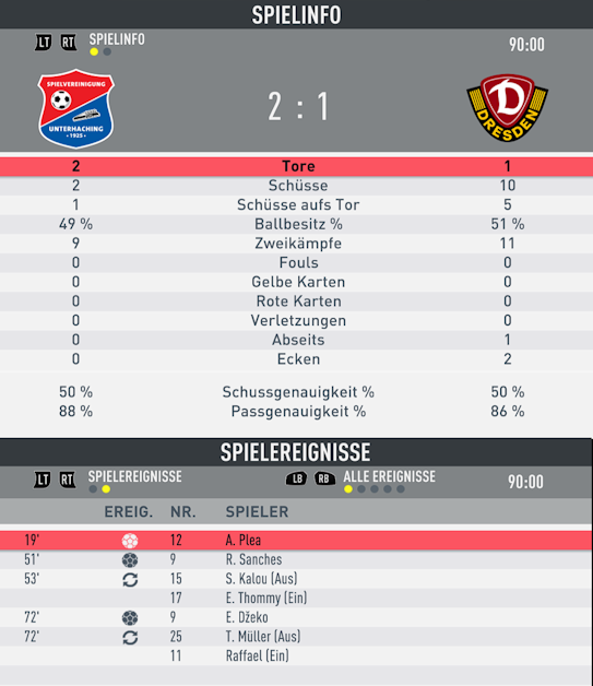 10. Februar 2020 #1 Cobra (Roland B.) (Daniel Meißner) Rosenholz 1. BuLi - 22. Saison - 25. Spieltag Sanches (1)Pléa (1) (1) Dzeko Zuschauer: 25.600 S P I E L B E R I C H T