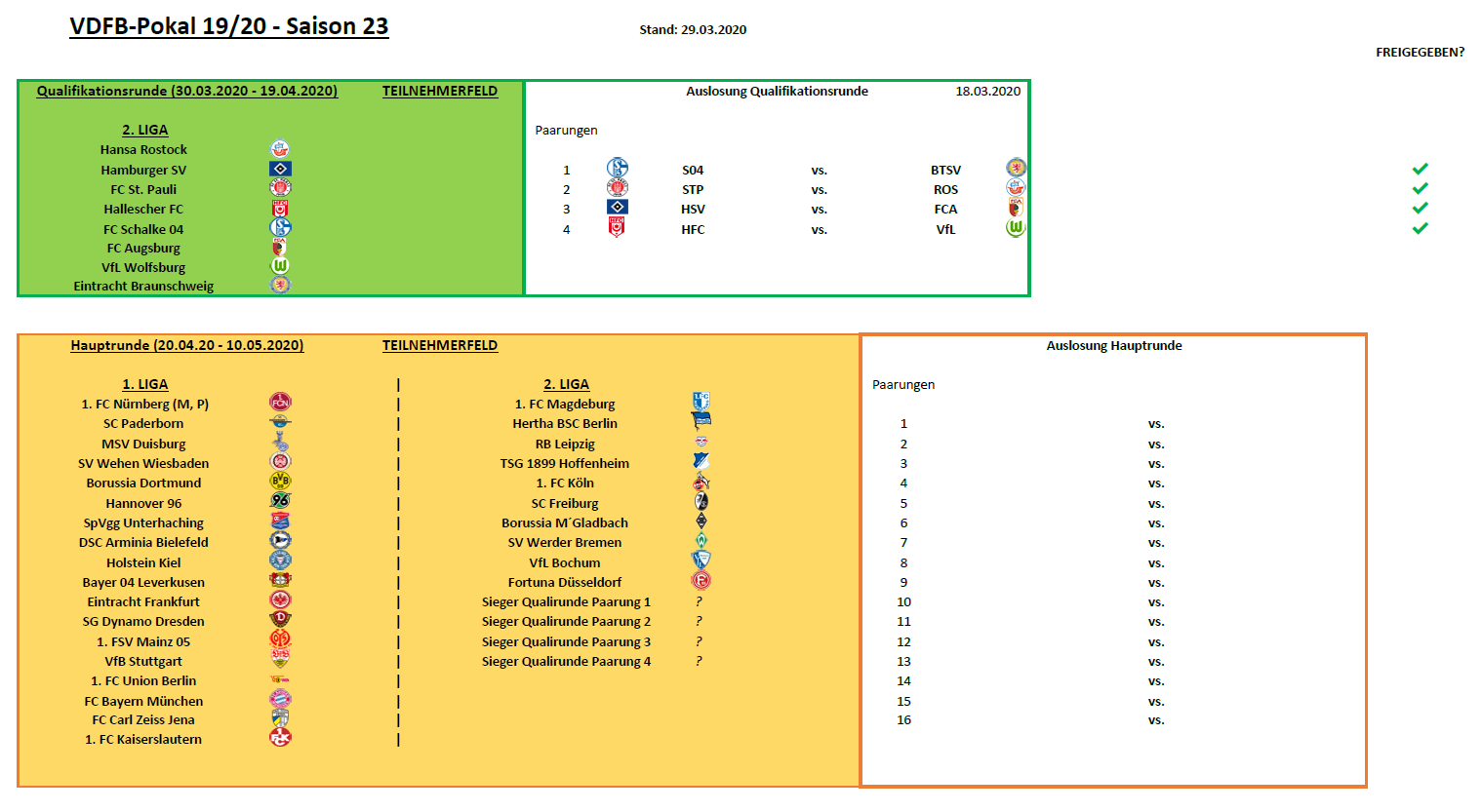 - Die unten folgende Pokalübersicht wird regelmäßig aktualisiert, der Spielplan ist aber natürlich auch gesondert im VDFB-Pokal-Reiter auf der Hauptseite verfügbar.