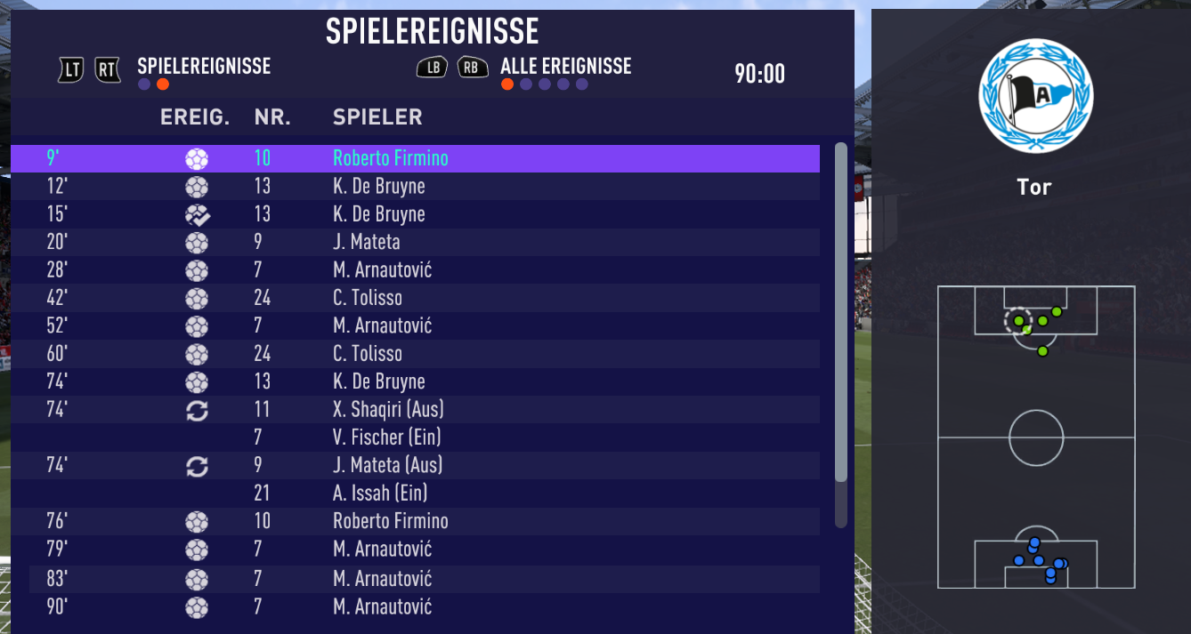 | Tolisso (2) Mateta (1) Arnautovic (5) | (3) De Bruyne (2) Firmino | |||