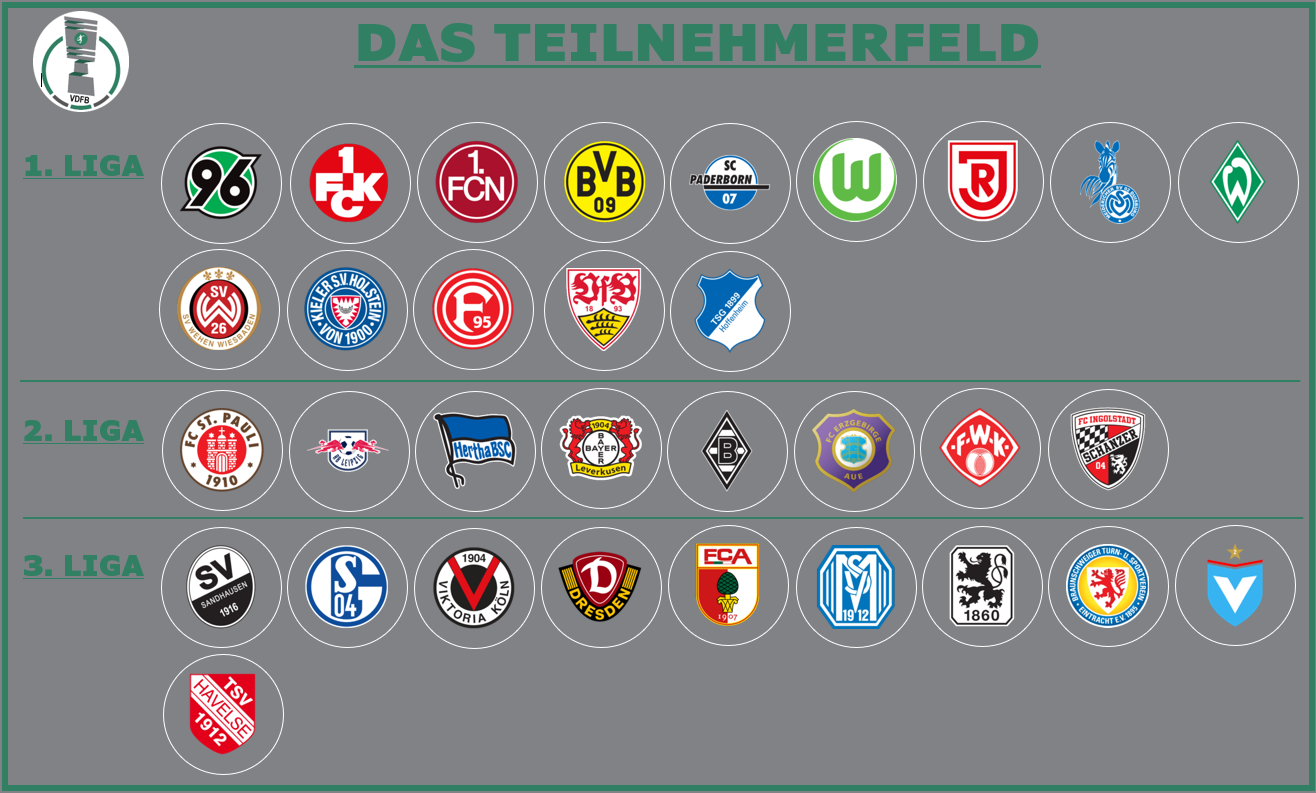 - Gleich 10 Drittligisten, so viele wie noch nie seit Wiedereinführung des alten Pokalmodus, haben den Sprung in die Hauptrunde geschafft. Darüber hinaus sind 8 Zweitligisten und 14 Teilnehmer aus dem Oberhaus im Lostopf. Eine Übersicht seht ihr hier: