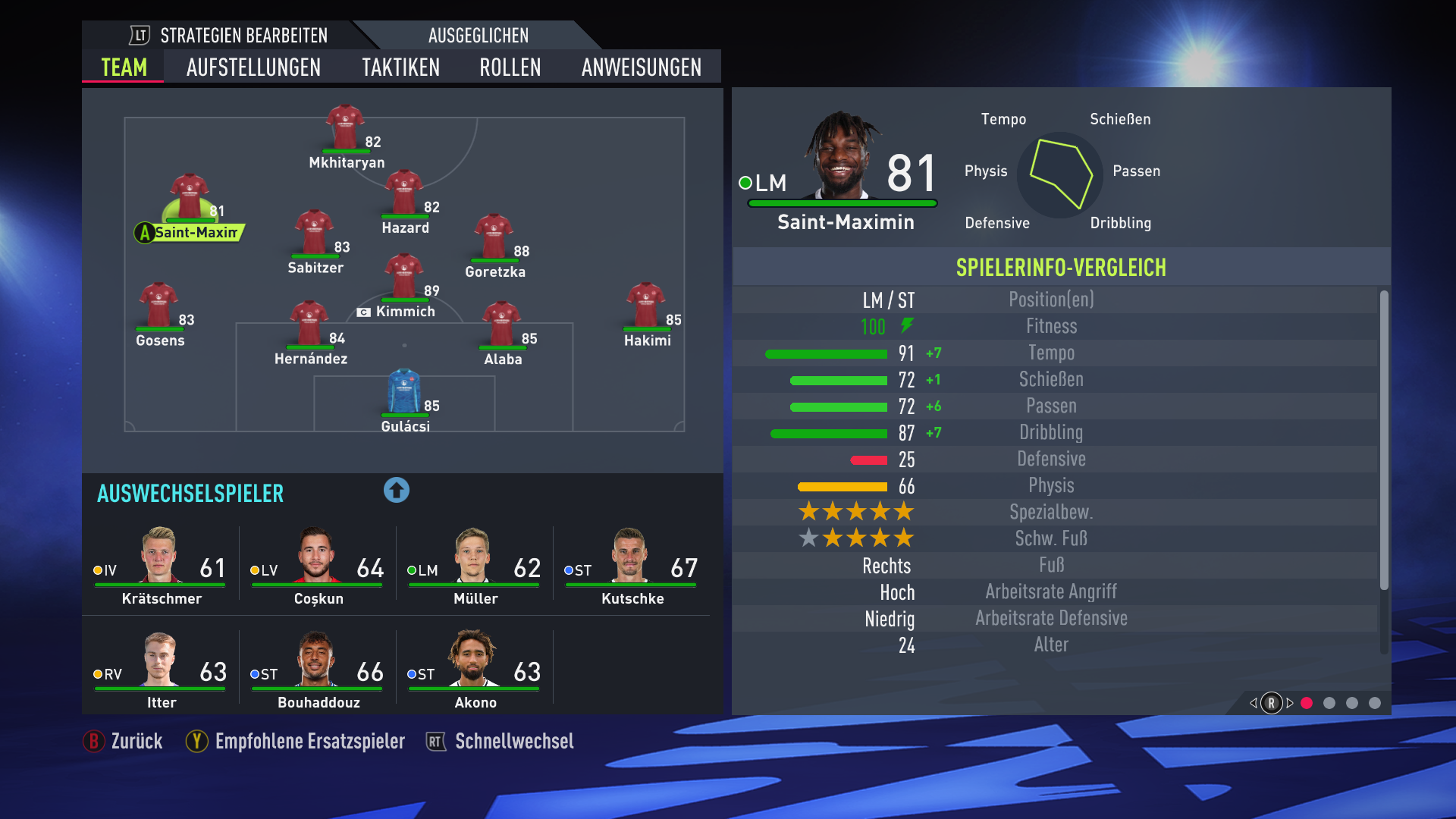 LM/RM: Tempo +8, Schießen +1, Passen +6, Dribbling +7