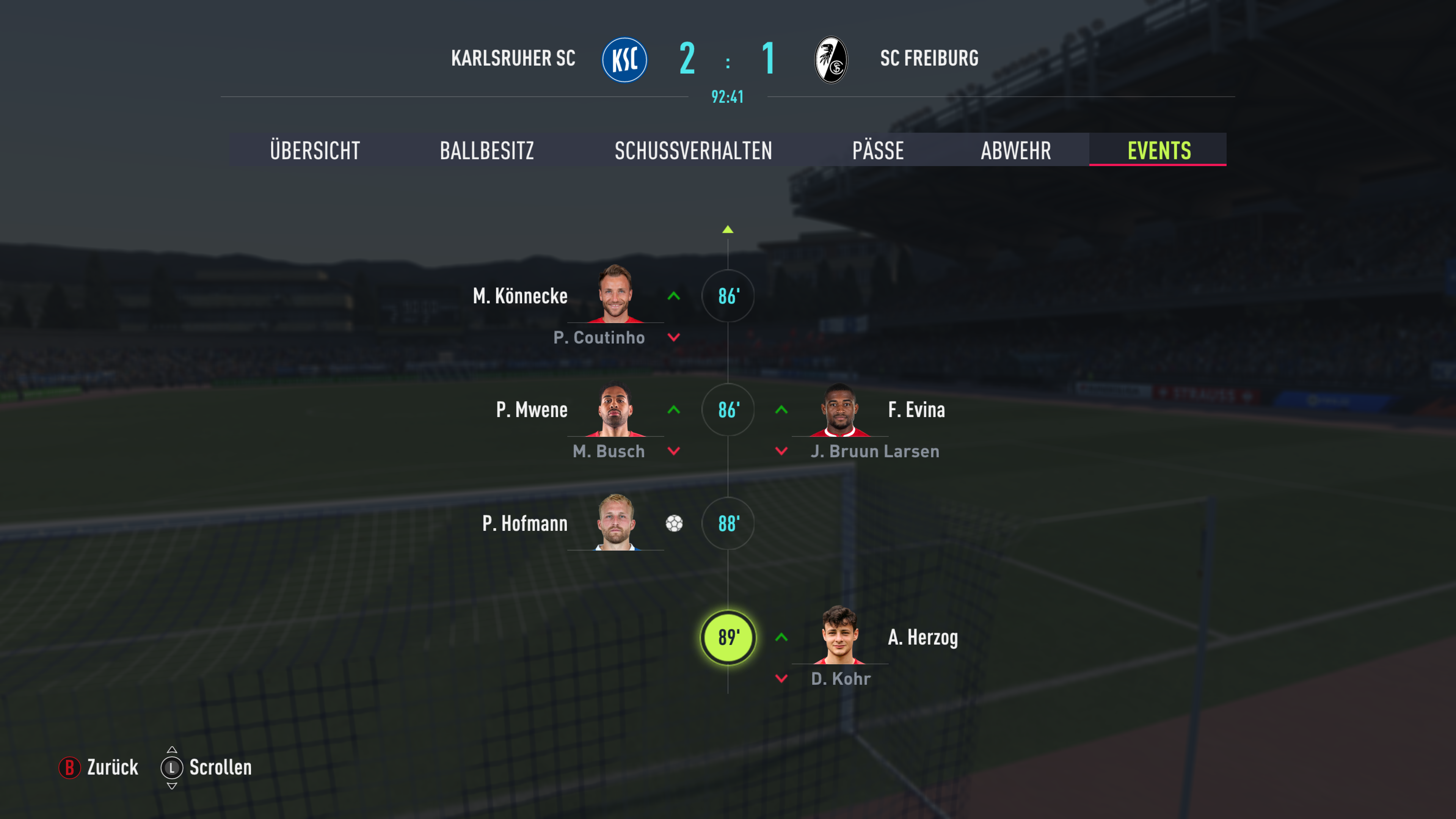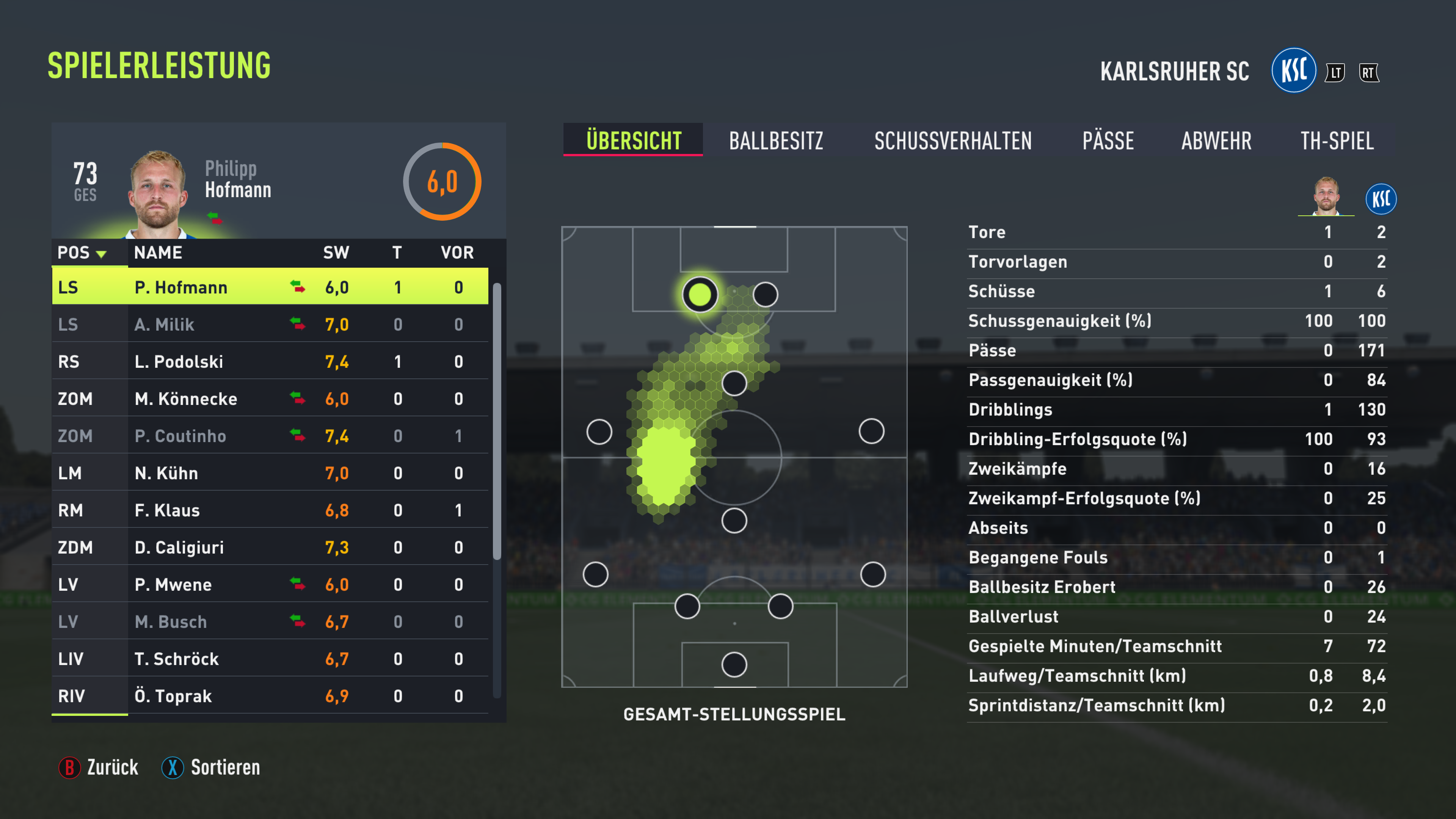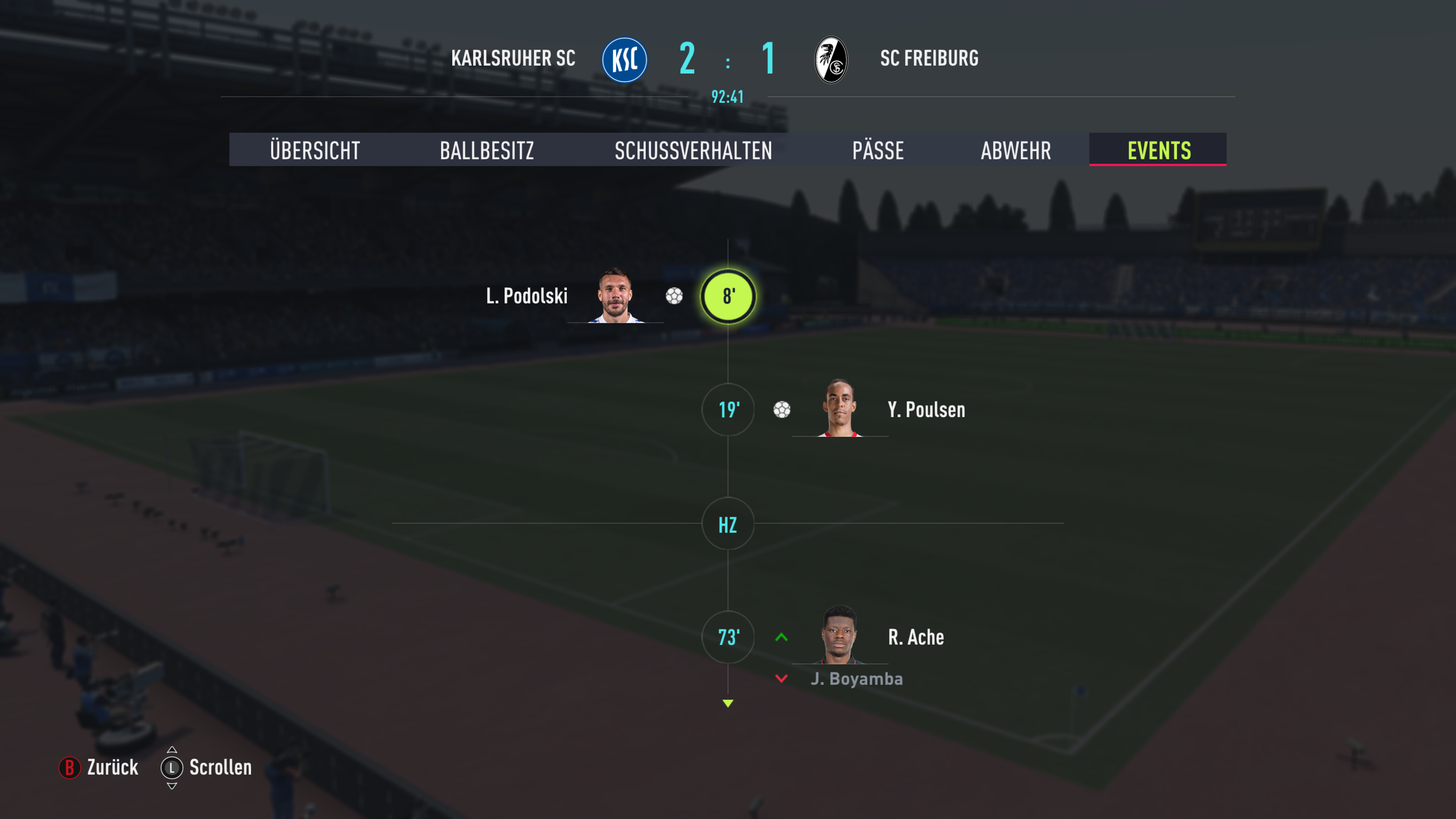 | Es war ein Spiel auf Augenhöhe Das Spiel wurde mit Glück gewonnen Weil in der 8 min Kolke (SCF) den Ball nicht festhalten konnte und Podolski (KSC) zum 1:0 verwandelt. In der 19 min hatte Poulsen (SCF) die Chance von der 16er-Kante zu schießen und haute das Leder in den Winkel zum 1:1 Ausgleich. Dann war es ein Schlagabtausch, aber alles ohne Erfolg, da beide hinter Mannschaften einfach sehr gut standen. Bis zur 86 min, da rutsche der Ball durch die Abwehr vom SCF auf den freien Hofmann (KSC) und der schlenzte ihn am Torwart vorbei zum 2:1 Endstand. Danke an FlashArt für das nett Gespräch und zur gleichen Meinung vom Spiel | ||||
