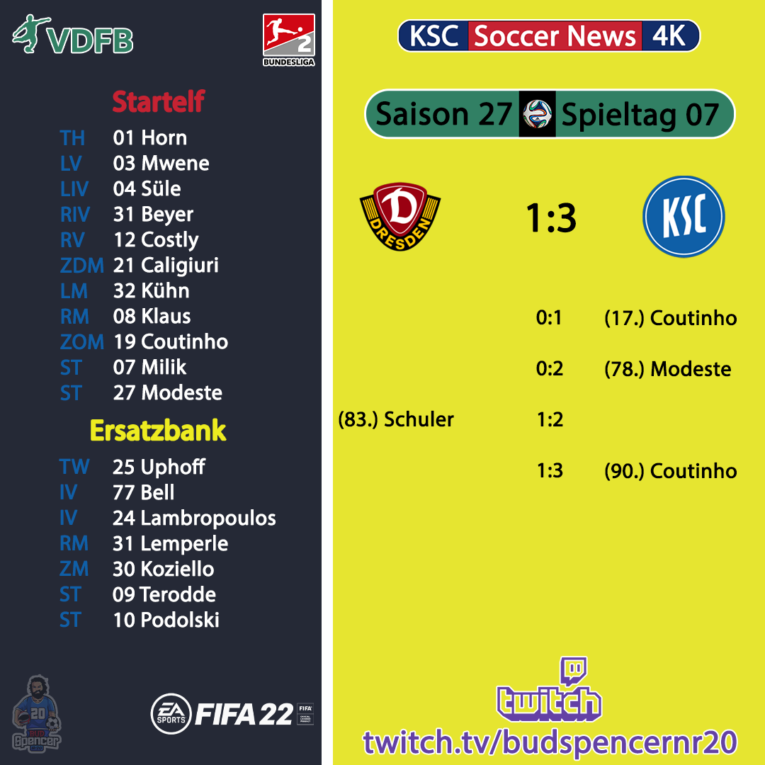 | Ein gutes und faires Spiel mit einem komischen Tor zum Schluss Der KSC geht in der 17. Min durch Coutinho nach einem Querpass von Caligiuri in Führung. Dann gab es eine lange Durststrecke mit vielen Chancen vom SGD, die zu Glück von der KSC Abwehr gestoppt werden konnten. Der 78. Min war es dann wieder Zeit für ein Tor :) Modeste trifft bei seinem 1. Spiel für den KSC zum 0:2 nach Querpass von Kühn und setzt sich schön gegen den Abwehrspieler durch. In der 83. Min der Anschlusstreffer für den SGD durch Schuler zum 1:2. Und zum Abschluss kommt dann noch das komische Tor von Coutinho zum 1:3. (Schaut es euch gerne im Stream an!) LOB an den Trainer von SGD und bis zum Rückspiel ich freu mich | ||||