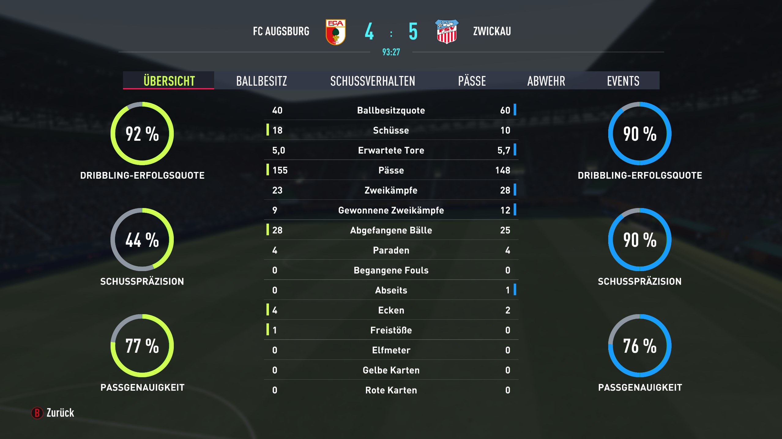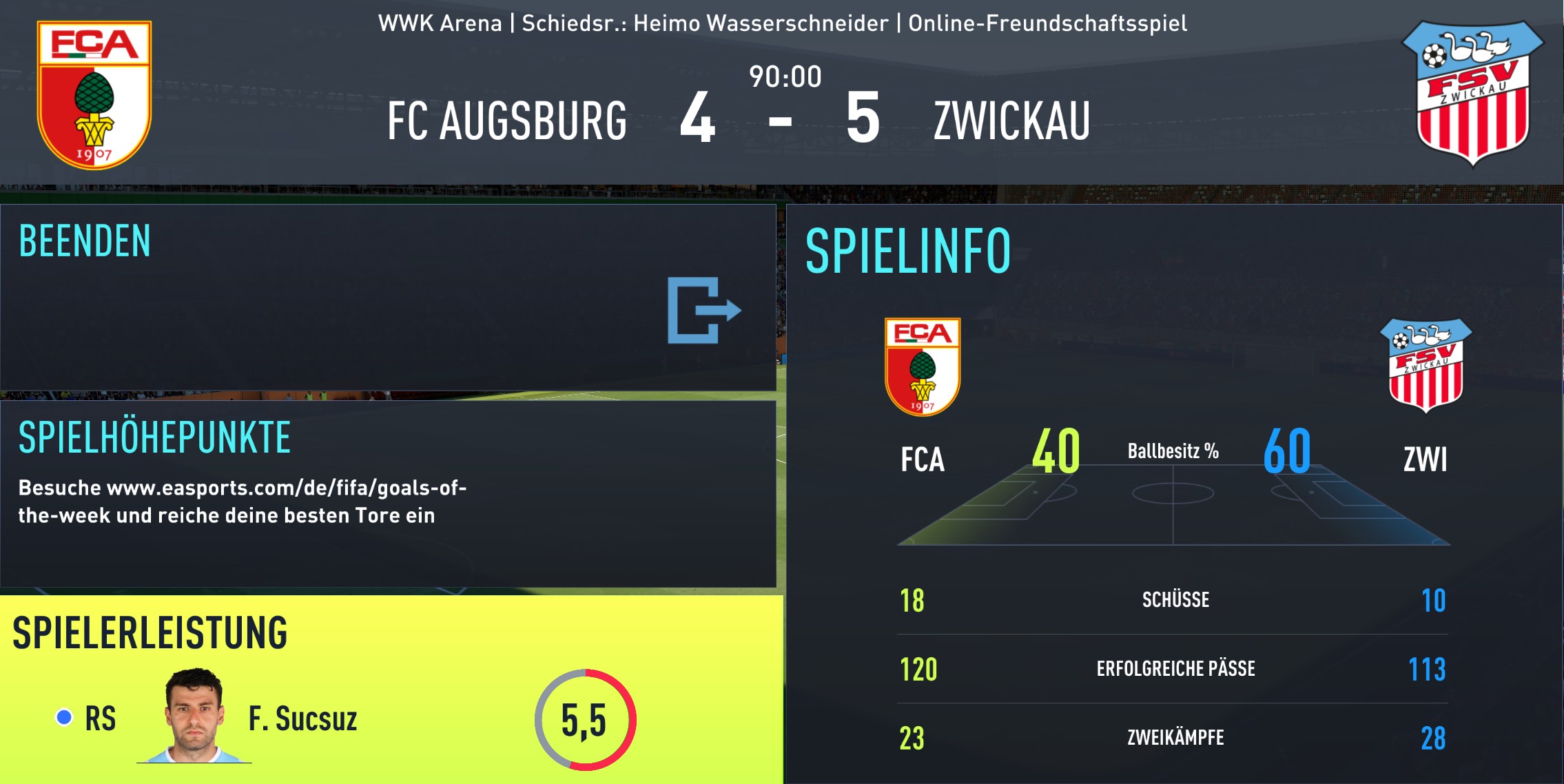 Topspiel am 16 Spieltag in Augsburg! Beide Teams schenkten sich nichts und legten gut los. Zwickau konnte nach 20 Minuten direkt mit 0:2 in Führung gehen. Augsburg schockte das aber nicht und machte in der 25 Minute den 2:1 Anschlusstreffer. Es war ein Ping Pong spiel. Zwickau machte das 3:2 und Augsburg das 3:2 Zwickau machte das 4:2 und Augsburg das 4:3. Doch dann bricht die 83 Minute an und Augsburg gleicht durch Kleindienst zum 4:4, Ausgleich... Man merkte Zwickau wollte mehr als nur den 1 Punkt nach 4facher Führung mitnehmen, also alles nach vorn. Fast hätten sich die Schwäne noch das 5:4 gefangen aber Hradecky hält Weltklasse! Nach 3 Ecken in folge hatte Zwickau den Ball und ab nach vorne. Irgendwie kommt Jastrzembski an den Ball und macht in der 93 Minute den 4:5 SIEGTREFFER und zugleich auch sein 4 Tor in dieser Partie! Zwickau nimmt die 3 Punkte mit nach Sachen und beißt sich weiter im obersten Tabellenhaus fest! Über eine Punkteteilung hätte sich heute aber auch niemand beschweren dürfen.