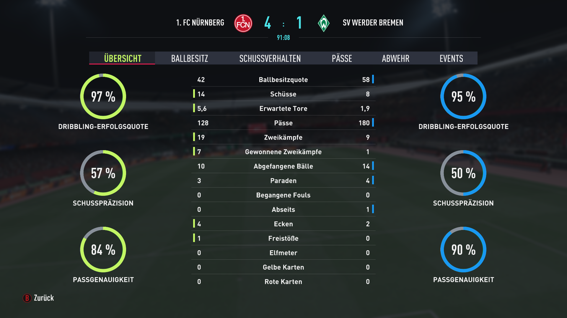 | Im Saisonendspurt konnte der Club, für den es jetzt nurnoch um Siegprämien geht, die Aufgabe gegen starke Bremer lösen. Der SVW reagierte gut auf die frühe Führung des FCN und hatte noch Chancen auf mindestens ein weiteres Tor. In der Defensive fanden die wendigen Saint-Maximin und Mkhitaryan aber das ein oder andere Mal zu viel die Lücke und schraubten das Ergebnis etwas schmeichelhaft in die Höhe. Ansonsten war es aber ein hochklassiges Spiel, in dem beide Teams viel versuchten! Viel Erfolg noch an die Weser! | ||||