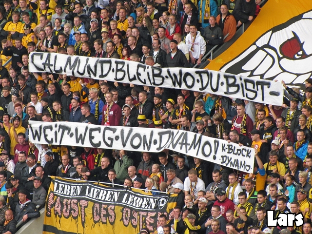 Im Rudolf-Harbig-Stadion blieb die Atmosphäre angespannt. Zu Spielbeginn zündeten die mitgereisten Fans aus Frankfurt mehrere Feuerwerkskörper, sodass das Spiel mit zwei minütiger Verspätung angepfiffen wurde. Während die Frankfurter Fans sich also von ihrer schlechten Seite präsentierten, erwischte ihr Team auf dem Rasen einen guten Start ins Spiel. Nach nur 15 Minuten brachte Jonas Hofmann die Gäste in Führung. Es war noch nicht mal eine halbe Stunde gespielt, da erhöhte Julian Draxler bereits auf 0:2. Dresden hatte Glück, dass es zur Halbzeit beim 0:2 blieb, denn Weigl traf kurz vorm Pausentee noch das Aluminum. Zum Anpfif der zweiten Halbzeit zeigte dann die Heimkurve ein Banner, welches den kompletten K-Block bedeckte (Foto). Die schöne Seite der Fankultur. Die motivierende Stimmung auf den Rängen machte sich auch auf die Mannschaft von Trainer Rosenholz bemerkbar, die trotz des 0:2 Rückstandes nie aufgab. In der Offensive blieben die Hausherren allerdings zumeist harmlos, sodass der Erstligaabsteiger kaum Mühe hatte die Führung zu verteidigen. In der 72.Minute war das Spiel dann endgültig entschieden. Der Frankfurter Kone schickte Hofmann, der sich keine Blöße gab und zum 0:3 Endstand traf.