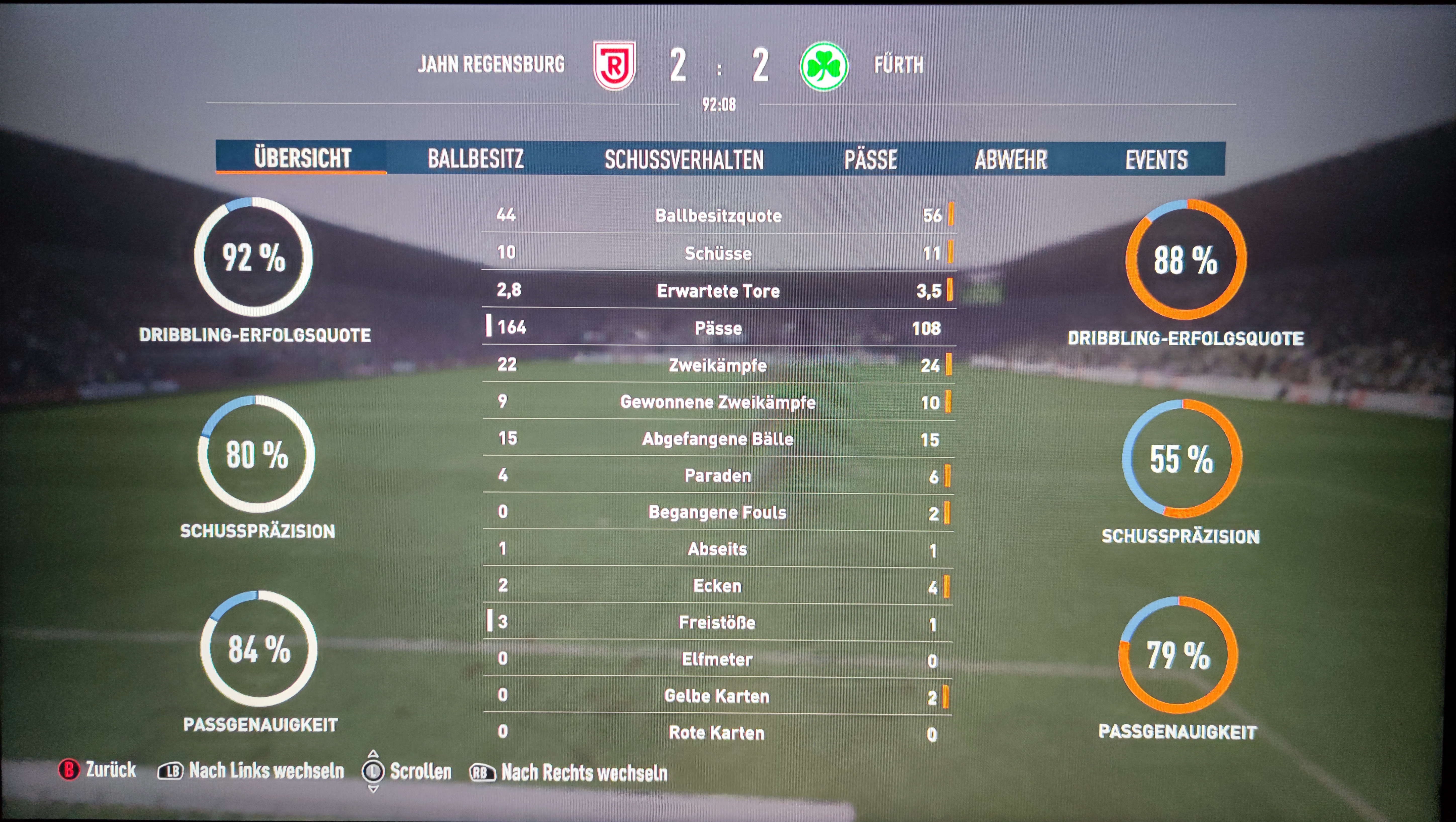 | Regensburg spielt eine sehr gute erste Halbzeit wo Chancen zum 2-0 oder 3-0 liegen gelassen werden. In der Zweiten Halbzeit kommen die Fürther viel besser ins Spiel und konnten das Spiel auch fast für sich entscheiden. Am Ende ist das unentschieden akzeptabel für beide Seiten. 1-0 Kramaric 3' 1-1 Burke 63' 1-2 Redondo 76' 2-2 Dennis 84' | ||||