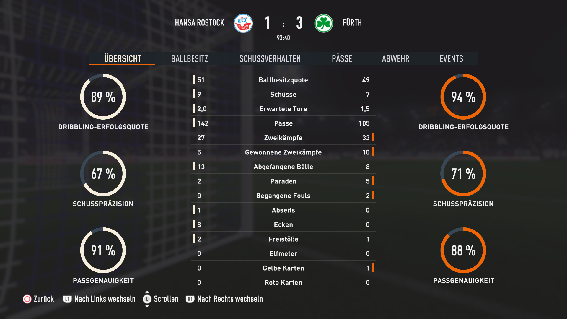 | gg Die Franken erwischen einen Traumstart und können früh in der 2. Minute durch Berisha in Führung gehen. Danach passiert eher weniger und beide Team stehen recht sicher, Hansa versucht es häufiger mal aus der Distanz und war besonders nach kurz ausgeführten Ecken sehr gefährlich. Nach einer halben Stunde erhöht Burke auf 2:0 und mit dem Ergebnis ging es auch in die HZ. Nach der Pause die Hanseaten etwas spielbemühter und übernommen ein klein wenig die Spielkontrolle. In der 52 Minute war es dann soweit und Narey kann nach einer der vielen kurz ausgeführten Ecken auf 2:1 verkürzen. Darauf die Franken wieder etwas fokussierter in der Defensive und lassen kaum noch Chancen zu, dafür fällt nach einem Konter über die rechte Seite über den flinken Nelson das 3:1. Darauf passiert nicht mehr allzu viel, Berisha lässt noch nach einem weiteren Konter eine 100 % liegen. Somit holen sich die Franken auswärts in Rostock einen wichtigen und auch wohl verdienten 3er, da die Hanseaten zwar häufiger aufs Tor schossen aber nur selten aus gefährlichen Situationen. | ||||