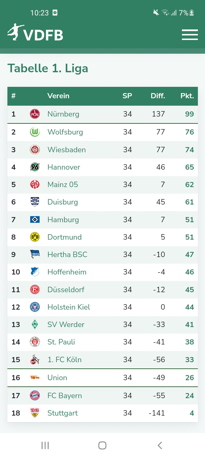 Wie in der zweiten Liga wurde am gestrigen Montag auch in der 1.Liga mit der Freigabe des 34.Spieltags der Saisonendspurt eingeläutet. Die wohl wichtigste Entscheidung wurde dabei wieder einmal vorzeitig entschieden. Der 1.FC Nürnberg ist wieder einmal VDFB Meister! Damit hat der Erfolgstrainer der Franken, Dosenbrot, nun auch tatsächlich mit dem Rekordmeister Pascal (MSV Duisburg) gleichgezogen. Beide Trainer holten unfassbare acht Meisterschaften. Während die Meisterschaft bereits vergeben ist, kämpfen im unteren Tabellenbereich noch vier Mannschaften um den Klassenerhalt. Der VfB Stuttgart steht derweil bereits als Absteiger in die 2.Liga fest!