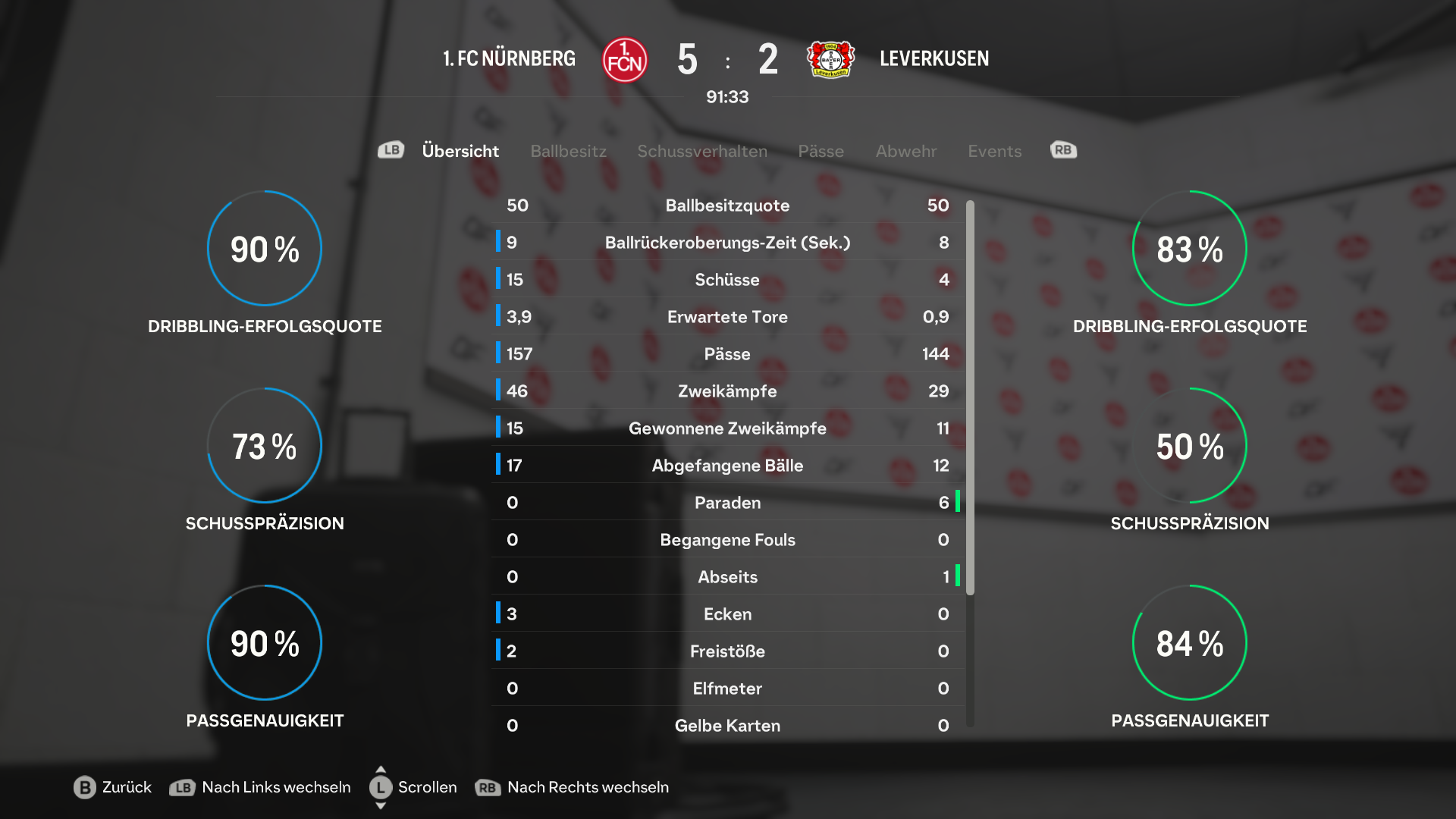 | Im abendlichen Flulichtspiel zwischen dem Club und Bayer 04 behielt der FCN die Oberhand, weil er sich mal wieder auf die Offensive verlassen konnte. Son und Co. bewiesen zu häufig die nötige Coolness vor dem Tor und zeigten auch zweimal aus der Distanz (jeweils an die Latte) ihre individuelle Klasse. Doch auch Bayer spielte gut mit und bestrafte zwei defensive Schwächen des Clubs zum zwischenzeitlichen 3:1 und 4:2. Wieder einmal probierte es der Club mit hohem Pressing, was den Gastegebern hohe Ballgewinne bescherte. Doch auch die Bayer-Defensive konnte den ein oder anderen Konter gut verteidigen, sodass es lange beim Zwei-Tore-Vorsprung blieb. | ||||