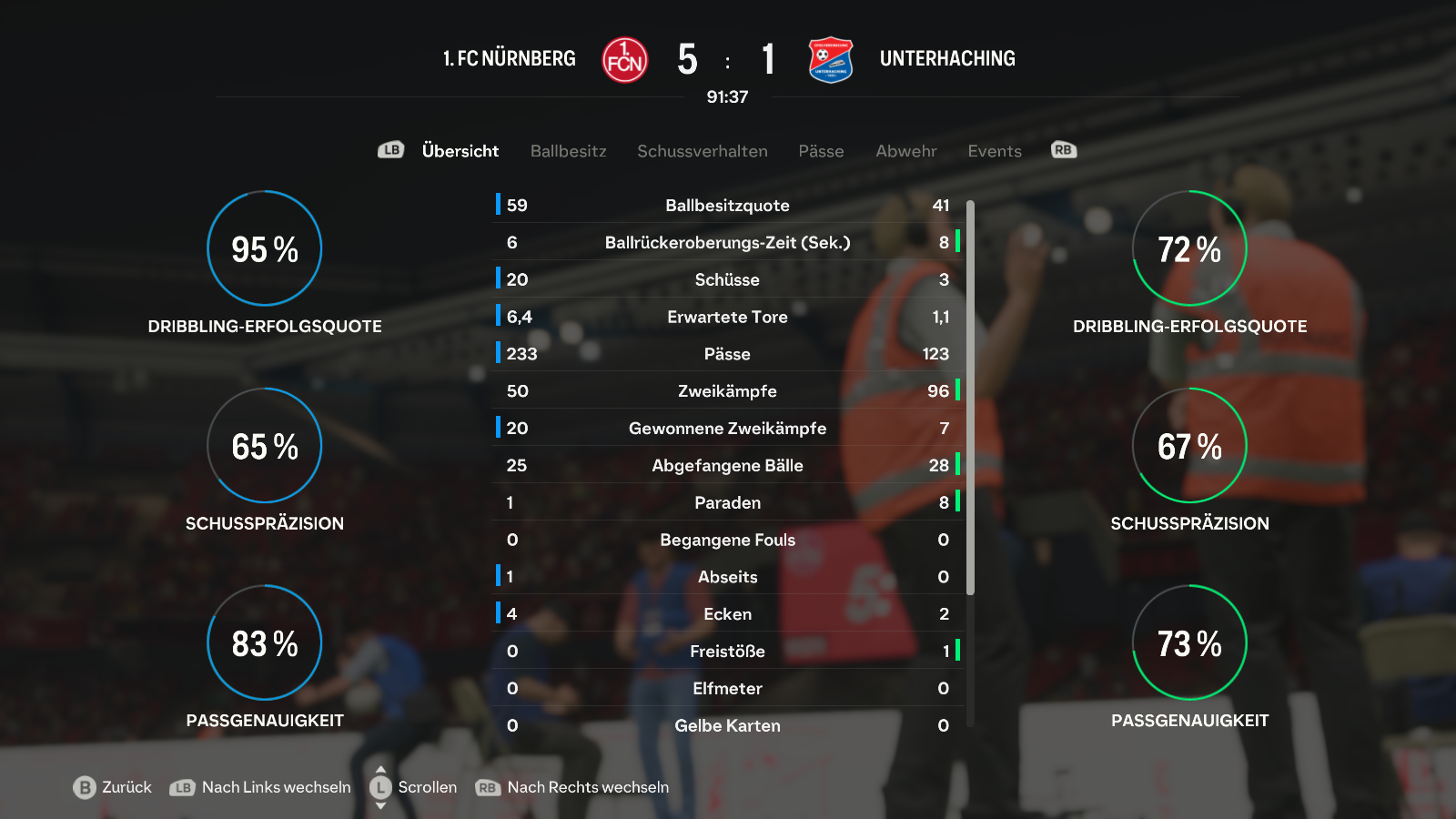 | Das Max-Morlock-Stadion singt Franconia Fantastica - der Club ist zum 11. Mal VDFB-Meister. Doch vor dem großen Jubelschrei brauchte es noch einmal 90 Minuten konzentrierten Fußball, denn die Gäste aus Unterhaching, die wie in der Hinrunde niemals aufsteckten, kamen selbst nach dem 2:0 per Ecke plötzlich zurück. Doch zu oft setzte sich die offensive Qualität des FCN durch, sodass für die Gäste zu viele Löcher zu stopfen waren. Zahlreiche Chancen wurden aber nicht genutzt und so blieb es lange Zeit bei einem 3:1, ehe doch noch de Bruyne aus der Distanz und Mkhitaryan nach Konter den Deckel drauf machten. Großen Respekt nicht nur an Unterhaching, für die nun wohl der bittere Gang wieder in die Zweitklassigkeit wahrscheinlicher geworden ist, sondern auch an das Verfolgerfeld in dieser Saison! Als FCN muss man eher froh sein, dass FC24 nun ein Ende findet, denn gerade Wehen Wiesbaden hat so manche Lücke bis nach ganz oben geschlossen (<. ziel nummer eins zur neuen saison also wieder: doubleverteidigung> | ||||