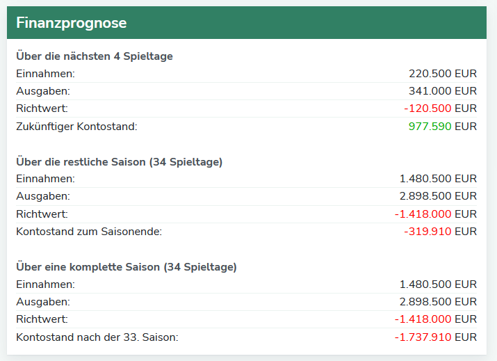 Hallo deCoo ich verstehe meine Finanzprognose auch nicht. Letzte Saison war alles im grünen Bereich und ich hatte beim Übergang von Hinrunde zu Rückrunde eine Prognose von +1Mio. Genau so ist es dann auch gekommen - hatte am Ende 1Mio aufm Konto. Dann habe ich mir für ca 400K das Stadion ausgebaut. Kontostand jetzt 500K. Finanzprognose bis zur Ende der Saison jetzt plötzlich -2,1 Millionen. Wie ist das möglich?