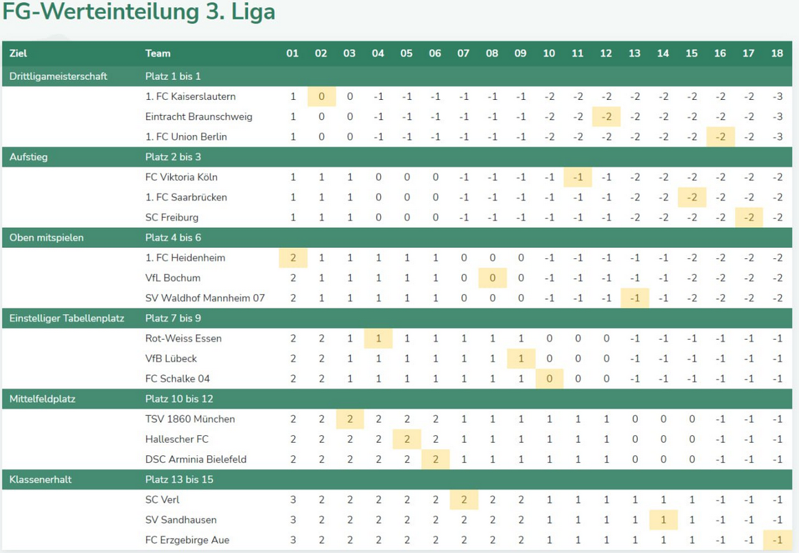 ...quasi seit Anbeginn des VDFBs war die Einteilung aller Teams einer Liga in Kategorien zum Saisonziel die Bewertungsgrundlage für die Verteilung von FGs. Der FG, der Fangrößen-Wert, ist und bleibt ein zentraler Kennwert für einen Verein bei der Berechnung der Zuschauereinnahmen (an denen sich zu Saison 32 nichts ändert), bei der Berechnung der Siegprämie bei Sieg und Unentschieden (ändert sich auch nicht zu Saison 32). Saisonziele wie "Mittelfeldplatz", "Einstelliger Tabellenplatz" usw. waren für alle Trainer ein Begriff und fassten immer 3 Teams in eine Kategorie zusammen, übergeordnet in einem Index (die alte Matrix dürfte vielen noch ein Begriff sein).