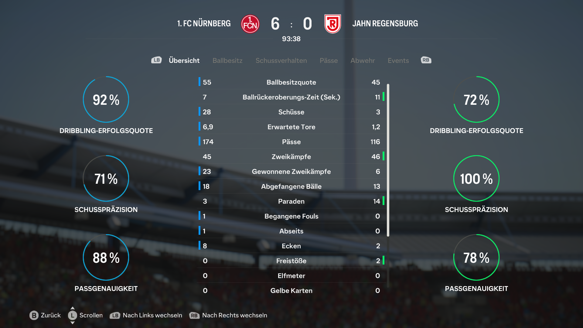 | Mit dem SSV Jahn war heute ein Aufsteiger zu Gast beim Rekordmeister, der sich als Stolperstein beweisen wollte. Die erste Aktion gehörte gleich den Gästen, die über Marmoush (in der 1. Hälfte noch links eingesetzt) bis in den Strafraum kamen. Der Club brauchte mal wieder eine Einzelaktion, die durch Son per Schlenzer abgeschlossen wurde (11.). Selbiger schnürte dann als Anti-Klimax gleich in den nächsten 15 Minuten den Hattrick, nachdem die überforderte Abwehr des Jahn den wenigen Südkoreaner nicht stoppen konnte. Hingegen war es Grill, der den SSV lange das 3:0 hielt. Insgesamt 28 Schüsse, davon viele aus der Distanz als es der Club ruhiger angehen ließ, wurden von der Nummer 1 entschärft. Erst spät in der 2. Hälfte fand der Club dann das Zielfernrohr und traf noch insgesamt 3 Mal, davon zwei Tore wirklich schmeichelhaft nach Abpraller und aus 26 Metern durch den MVP Heung-Min Son. | ||||