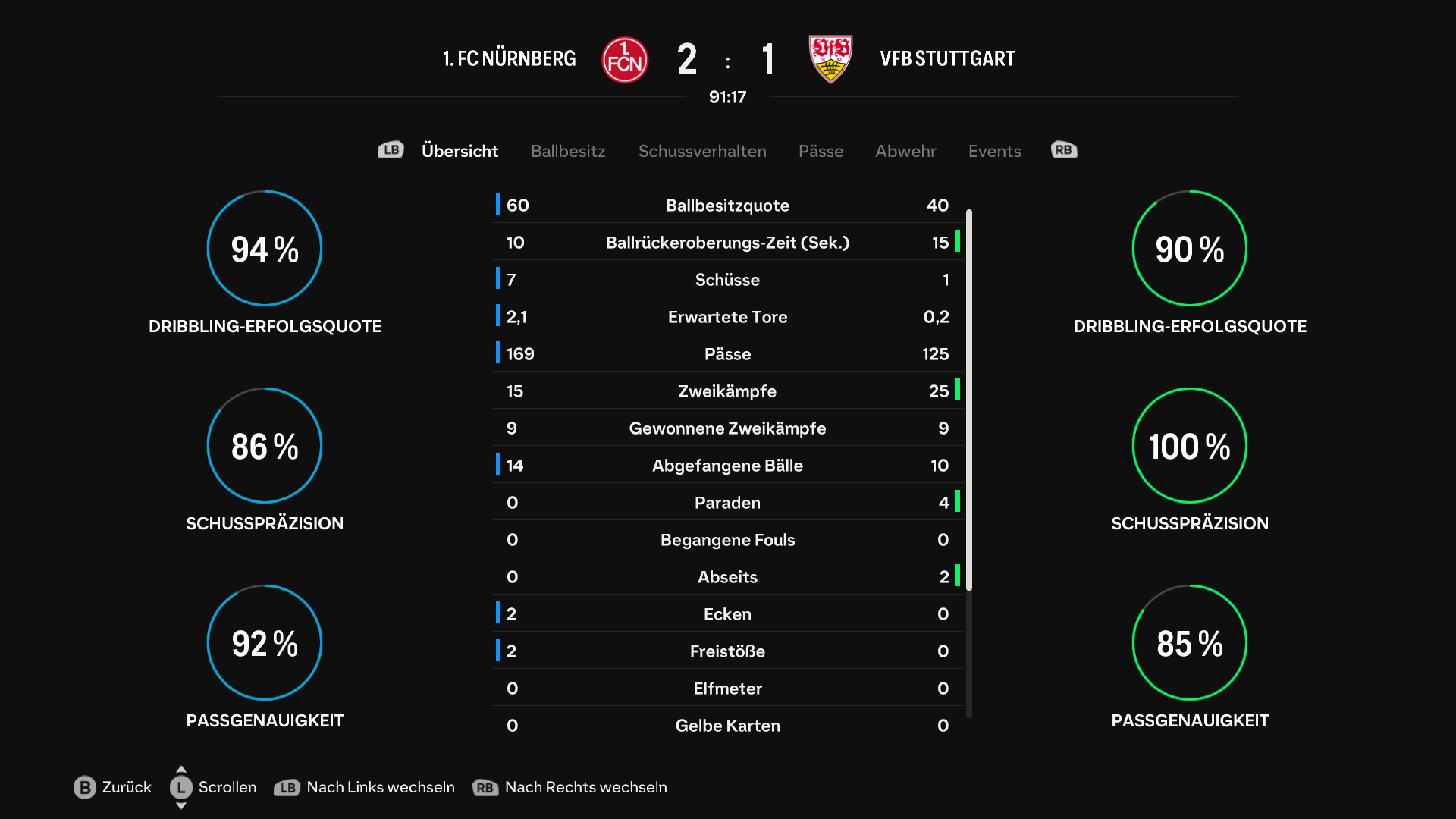 | Ein Spiel auf Augenhöhe, wenn man die Spielanteile betrachtet. Weil Stuttgart aus der erste und einzigen Chance gleich das 0:1 macht, muss der Club erst den Gang finden, bevor über de Bruyne und ein Eckentor durch Goretzka die Favoritenrolle ausgefüllt werden kann. Mit mehr Ballbesitz und Passgenauigkeit hielt man dann den VfB in Schach, der wiederum alles aufs überlegene Tempo über Außen setzte, jedoch zu häufig am vorletzten oder letzten Mann scheiterte. Hakimi vergab frei durch das 3:1 in der 80. Minute und bis zum Schluss hätte auch noch der Ausgleich fallen können, aber der VfB verpasste es noch einmal den Abschluss zu finden. | ||||