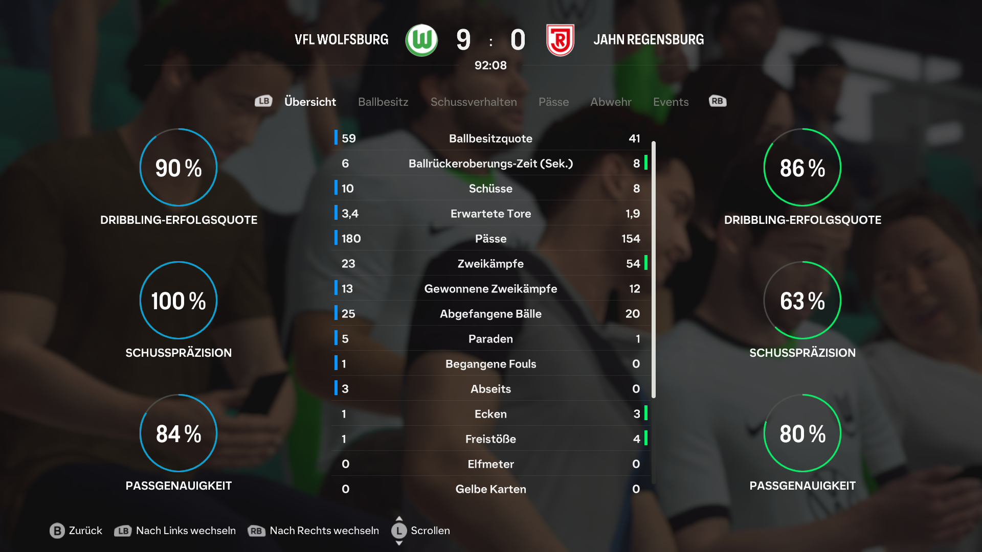 Am 17. Spieltag durften die Wölfe in der heimischen Volkswagen Arena den Jahn aus Regensburg willkommen heißen. Die Mannschaften gingen als Tabellennachbarn ins Spiel (10. gegen 11.), sodass sich die Zuschauer auf ein spannendes Spiel freuten. Beide Teams waren entschlossen den eigenen Fans einen würdigen Abschluss der Hinrunde zu liefern. Beide Teams versuchten sich von Beginn an Chancen herauszuspielen um das Ruder früh an sich zu reißen. Obwohl es Chancen auf beiden Seiten gab, waren es die Gastgeber die in der 14. Minute in Führung gehen können. Nach einem Steckpass von Sancho hat Füllkrug viel Wiese vor sich und kann den auf die andere Ecke spekulierenden Grill verladen. In der Folge stand Wolfsburg defensiv gut und kontrollierte das Spiel. Vor allen über stark getretene Ecken konnten die Regensburger immer wieder gefährlich werden, allerdings nichts Zählbares daraus ziehen. So ging es mit einem Leistungsgerechten 1:0 für die Niedersachsen in die Pause. In der zweiten Hälfte sahen die Zuschauer ein völlig anderes Spiel. Bereits kurz nach Wiederanpfiff, in der 48. Spielminute, kann Sancho nach einem Pass in den Rückraum von Aubameyang auf 2:0 erhöhen. Nur 7 Minuten später ist es Füllkrug der das Spiel mit dem 3:0 endgültig kippen lässt. Mit seinem 2. Treffer des heutigen Tages schien das Füllkrug-Festival eröffnet: in der 66., 75., 82., 86., 89. und 90. Minute legte der aktuelle Top-Torschütze der Wölfe noch 6 weitere Treffer nach. Letzlich ist über die 90 Minuten JEDER Schuss des gebürtigen Hannoveraners ein Treffer. Die Zuschauer rieben sich noch Minuten nach dem Abpfiff die Augen, ungläubig darüber was sie gerade gesehen haben. Für den Jahn aus Regensburg ist das heutige Spiel sehr unglücklich gelaufen. Hätte man eine der durchaus vorhandenen Chancen in der ersten Hälfte nutzen können, wäre das Spiel möglicherweise deutlich anders verlaufen. Wir bedanken uns noch einmal für das sehr faire Spiel und die netten Worte von Trainer Lewin200 nach Abpfiff & wünschen viel Erfolg für den Rest der Saison, schöne Feiertage und einen guten Rutsch ins neue Jahr!