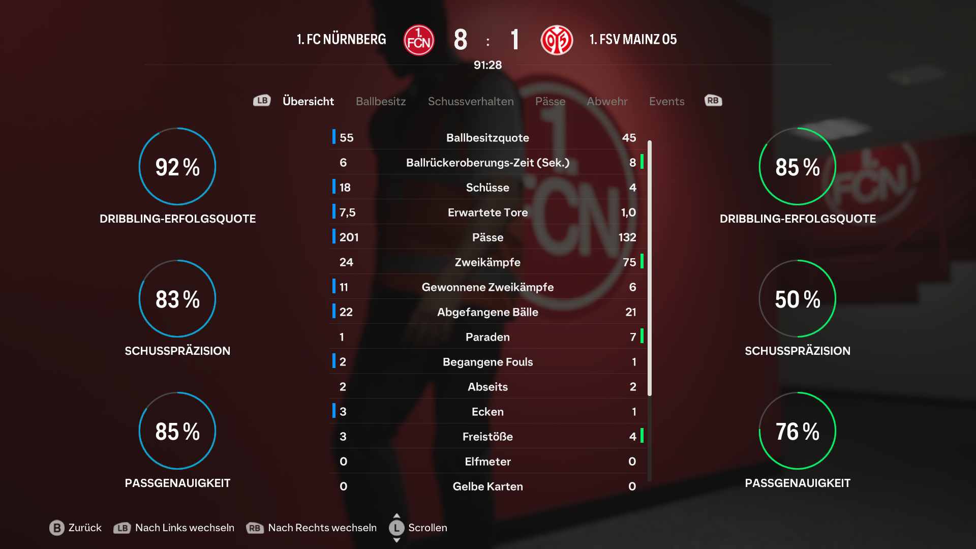 | Zum Auftakt in die Rückrunde gab sich der Favorit daheim keine Blöße und legte gleich los wie die Feuerwehr: Aus den ersten 6 Chancen, die sich der FCN erspielte (inklusive einer glücklichen Ecke) fallen gleich 5 Tore, sodass das Spiel nach 30 Minuten quasi durch war. Mainz versuchte alles und gab sich wirklich nicht auf, großen Respekt an den neuen Mann an der Seitenlinie! Lange fiel auch kein Tor mehr, weil Mainz besser rein kam und der Club nicht mehr zielstrebig genug war. Erst spät in der 2. Hälfte waren es dann die Konter, die einen für die Gäste am Ende zu hohen Endstand bedeuten. Ein Kopfballtor von Gray war aber die letzte erwähnenswerte Aktion, die die 05er als Trost in die nun leichteren Aufgaben (nach Duisburg und Nürnberg zum Auftakt) mitnehmen können. | ||||