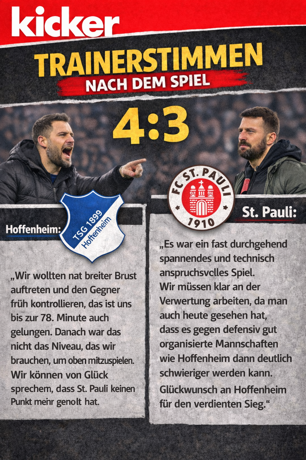 | Unter Flutlicht und vor dicht gefüllten Rängen in der PreZero Arena lag spürbare Spannung in der Luft. Die TSG Hoffenheim wollte als Tabellensiebter ihre Ambitionen untermauern, während der FC St. Pauli als 17. dringend Punkte im Abstiegskampf benötigte. Was folgte, war ein Spiel, das lange wie eine klare Angelegenheit wirkte – und sich am Ende in ein nervenaufreibendes Spektakel verwandelte. Hoffenheim begann druckvoll und setzte früh ein Zeichen. Bereits in der 5. Minute nutzte Christian Pulisic einen Vorstoß über außen, legte in den Strafraum auf Dani Olmo ab, der wiederum für Alexander Isak auflegte – und Isak vollendete eiskalt zur frühen Führung. Die TSG spielte dominant, ließ Ball und Gegner laufen und zwang St. Pauli immer wieder zu Fehlern. Einer davon führte in der 37. Minute zum nächsten Treffer: Nach einem Aufbaufehler von Timo Becker schnappte sich Bruma den Ball und schlenzte ihn unhaltbar ins rechte obere Eck. Kurz vor der Pause setzte Hoffenheim den nächsten Stich: Dani Olmo schickte Alexander Isak auf die Reise, der schneller war als die Verteidiger und den Ball an Karius vorbeischob – 3:0 zur Halbzeit, die Partie schien entschieden. Auch nach dem Seitenwechsel blieb Hoffenheim die tonangebende Mannschaft. In der 72. Minute brachte erneut ein Foul von Becker im Strafraum die Gäste in Bedrängnis. Alexander Isak trat an und verwandelte den Elfmeter sicher zum 4:0 – sein zweiter Treffer des Abends. In diesem Moment wirkte St. Pauli gebrochen, Hoffenheim feierte bereits. Doch dann kippte die Partie. In der 78. Minute brachte ein langer Ball Bülter in Szene, der die Übersicht behielt und auf Scienza querlegte – der schob zum 4:1 ein und brachte erstmals Hoffnung für die Hamburger. Nur drei Minuten später folgte der nächste Nackenschlag für Hoffenheim: Andrej Kramari? setzte sich mit einer starken Einzelaktion gegen Simakan und Tapsoba durch und verkürzte auf 4:2. Als Kramari? in der 83. Minute nach einem Abpraller von Nübel auch noch das 4:3 erzielte, verwandelte sich die zuvor ausgelassene Stimmung im Stadion in spürbare Nervosität. Die Schlussphase wurde zu einem offenen Schlagabtausch. Hoffenheim suchte die Entscheidung, St. Pauli den Ausgleich. In der Nachspielzeit hatte Christian Pulisic den fünften Treffer auf dem Fuß, doch St. Paulis Torhüter Loris Karius rettete mit einer spektakulären Parade aus kurzer Distanz und hielt seine Mannschaft im Spiel. Am Ende blieb es beim knappen 4:3 für Hoffenheim – ein Spiel, das die Gastgeber lange kontrollierten, dann aber fast aus der Hand gaben. Auf der einen Seite Isak mit einem Hattrick und auf der anderen Seite Kramari? mit seinem späten Doppelpack der für eine dramatische Schlussphase sorgte. Für St. Pauli reichte die starke Aufholjagd nicht mehr, doch sie verließen den Platz mit erhobenem Kopf – und Hoffenheim mit der Erkenntnis, wie schnell ein sicher geglaubtes Spiel kippen kann. 1:0 A. Isak (5.) 2:0 Bruma (37.) 3:0 A. Isak (45.) HZ 4:0 A. Isak (72.) Elfmeter 4:1 L. Scienza (78.) 4:2 A. Kramaric (81.) 4:3 A. Kramaric (83.) | ||||