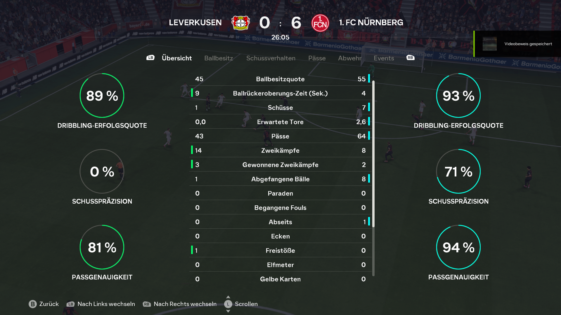 | In einer halben Stunde verwertete der Club 7 Chancen zu 5 Toren, wonach die Leverkusener die Segel strichen. Als wären die Clubspieler in Düsseldorf in Sportklamotten in den Bus eingestiegen und hier in der BayArena genau in dieser Form ausgestiegen. Wo waren solche Spiele gegen Bremen und Wiesbaden? | ||||