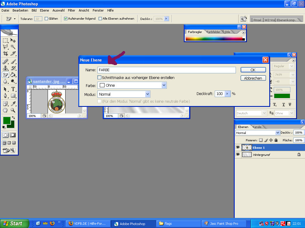danach geht ihr in das menü und erstellt eine neue ebene (bild 1) die ebene nennen wir FARBE (bild 2) - sonstige einstellung wie auf dem bild