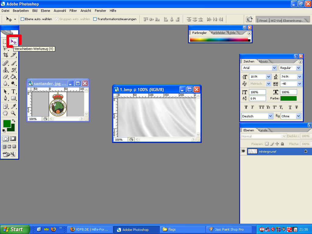 wir wählen das verschiebe werkzeug (in bild 1 mit rotem kasten markiert aus)