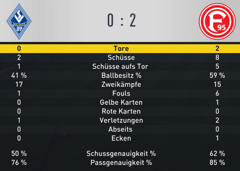 Kurz darauf war Schluss. Die Hausherren mussten die 3 Punkte in den Wind schreiben, wenn sie mit dem Lattenknaller in der ersten Halbzeit das Spiel auch hätten offener gestalten können. Düsseldorf siegte am Ende verdient - nicht zuletzt auch durch den ausgezeichneten Kader.
