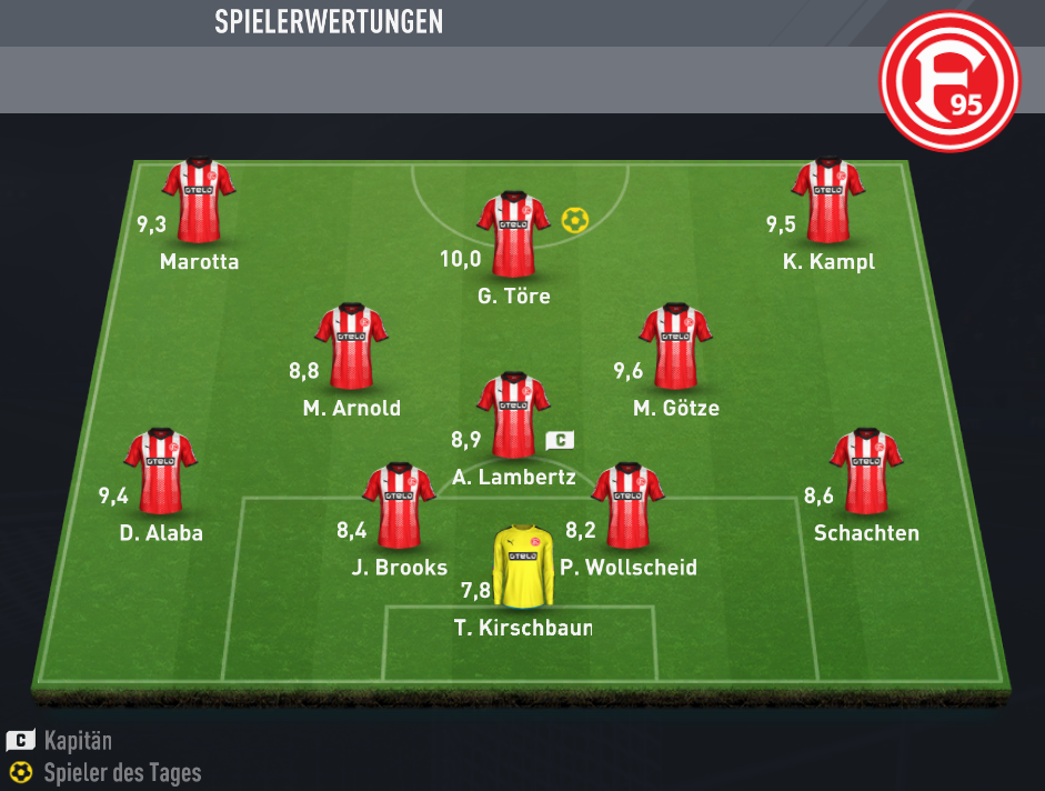 Braunschweig hatte noch eine weitere Chance auf den Ausgleich. Bei einem Konter über Lasogga hatte die Fortuna geschlafen. Der Stürmer setzte Teber durch die Gasse ein, doch der fand seinen Meister in Kirschbaum (78.). Das Spiel blieb aber weiter offen, denn beide Mannschaften schenkten sich nichts. Die letzte Gelegenheit bot sich dann den Hausherren. Kapitän Lambertz schlug von Halblinks einen herrlichen Diagonalball auf Kampl, der Blondschopf nahm das Leder elegant nach innen mit und schloss mit einem satten Flachschuss unhaltbar für Tank zum 3:1 ab (90.)