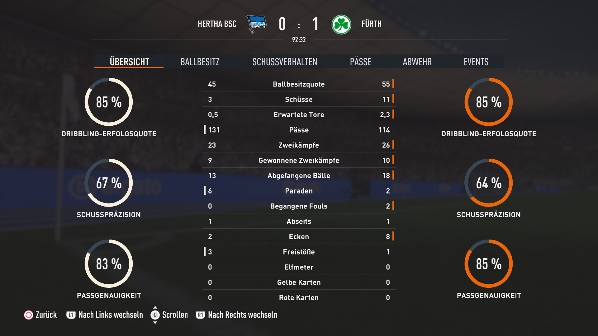 Kurz vor Schluss wird es nochmal richtig wild, Doan vergibt die Riesenchance zum Ausgleich ziemlich frei stehend vorm Tor und trifft nur den Pfosten und auf der Gegenseite scheitert auch Plea nach einen Querpass ziemlich frei vorm Tor und verpasst es den Sack zu zumachen. Aber die Franken retten das knappe 3:2 irgendwie über die Zeit und gewinnen diesen kanppen Pokalthriller