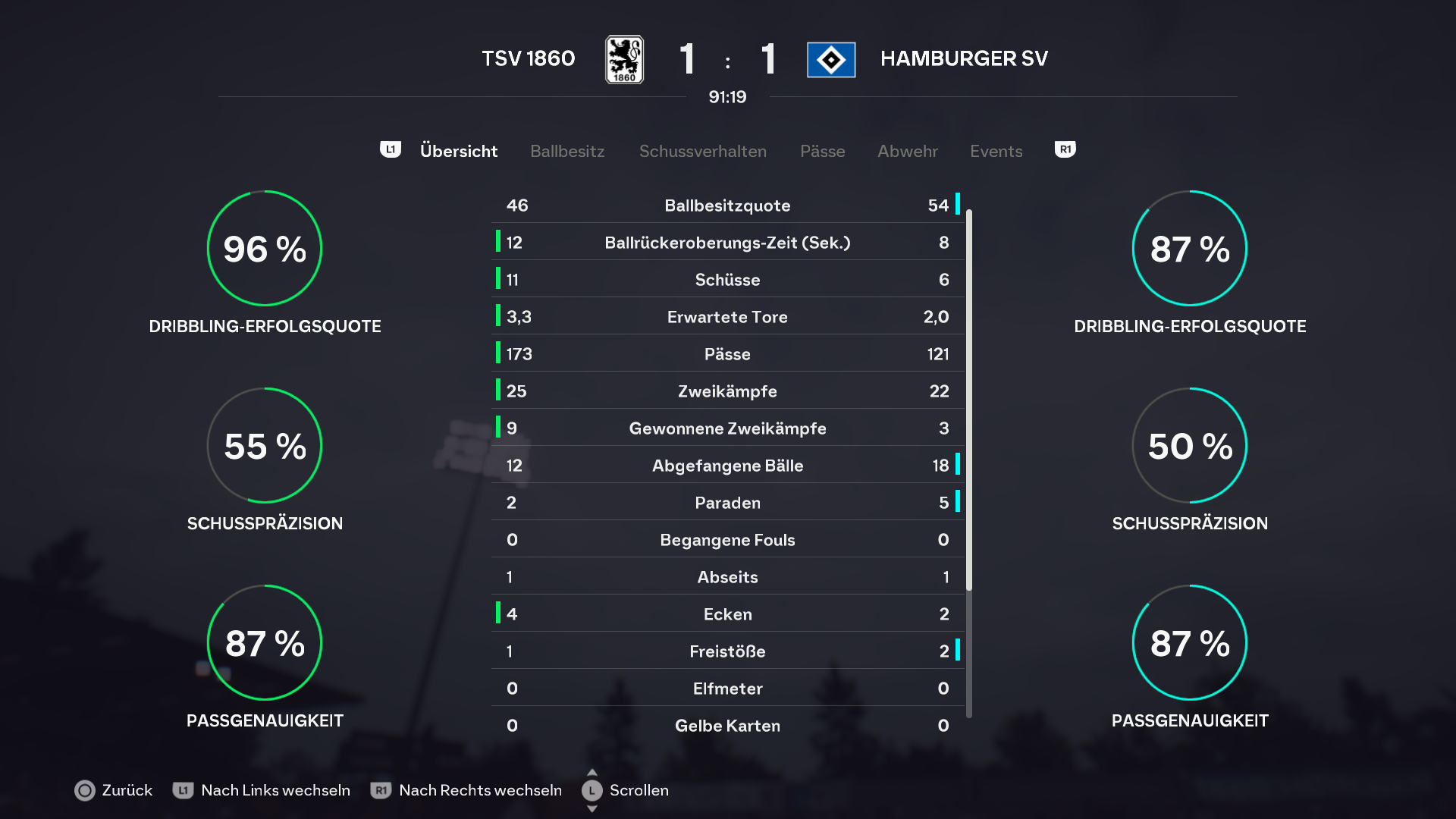 Chancenverwertung schwankt (z. B. Kane 100%-Chance vs. 1860)