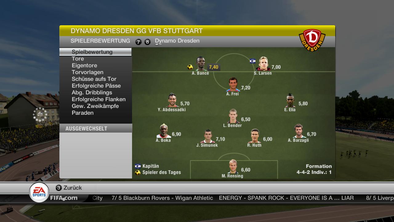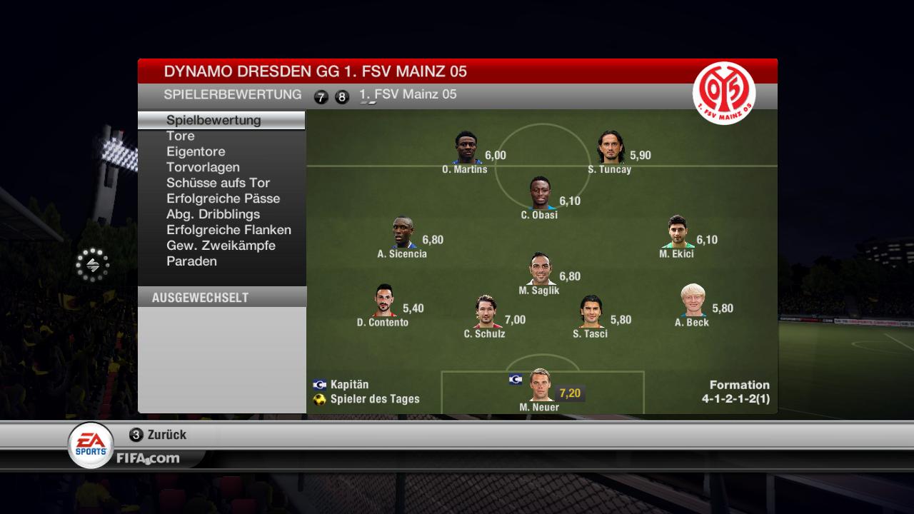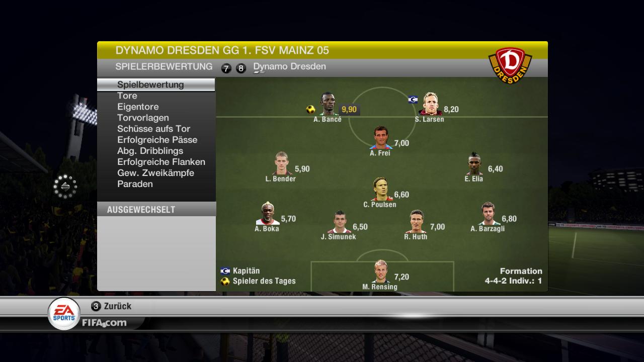 | Nach der mäßigen Tour über die Bundesliga-Dörfer konnte Dresden mal wieder ein Heimspiel bestreiten. Der FSV Mainz 05 gab sich die Ehre auf dem feinen Rasen im RHS. Von Beginn an entwickelte sich ein Duell auf Augenhöhe. Beide Mannschaften suchten sofort die Offensive und erste Chancen liessen nicht lange auf sich warten. Durch einen Doppelschlag von Bance legte Dynamo vor. Zwei akrobatische Einlagen knapp oberhalb der Grasnabe brachten das 1:0 für die Sachsen. Ein Konter kurz danach sorgte für eine beruhigende 2:0-Führung. Mainz versteckte sich aber nicht und kam kurz vor der Pause auf 2:1 heran, als Sicirgendwas einen harmlosen Schuss im Tor versenkte. Trainer Berndt fragte sich ernsthaft, wofür Torwart Rensing 2,5 Millionen im Jahr bekommt. Ein Zieler-Transfer kommt allerdings nicht in Frage, außer jemand möchte Rensing kaufen! (Gruß nach Köln). Nach der Pause ging das muntere Spielchen weiter. Dynamo konterte gefährlich und Mainz versuchte mit seinen Super-Technikern durch die Abwehrreihen zu dribbeln. In der 50. Minute stellte Bance allerdings den alten 2-Tore-Abstand wieder her. Nach einer Flanke nickte er (fast) unhaltbar per Aufsetzer ein. Der Mainzer Torwart Neuer sah dabei nicht wirklich gut aus. (Rensing!!!) Viele vergebene Chancen später war der Sieg für Dynamo unter Dach und Fach. Es blieb beim 3:1, wobei ein 6:4 auch locker drin gewesen wäre. Die besten (von Fifa ausgesuchten) Szenen gibts in der Zusammenfassung. | ||||